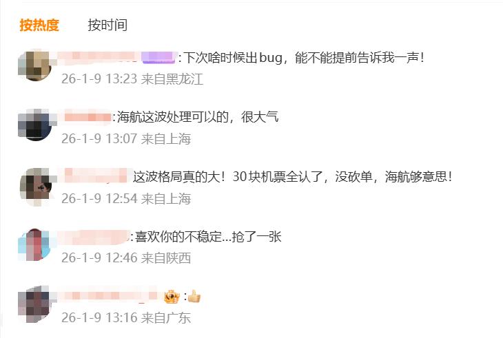 这一举措获得网友点赞,评论区有人表示“海航这波处理很大气”“几十块钱机票全认了,够意思”。不少抢到BUG票的网友也在社交平台分享“战果”,称自己是“幸运儿”。