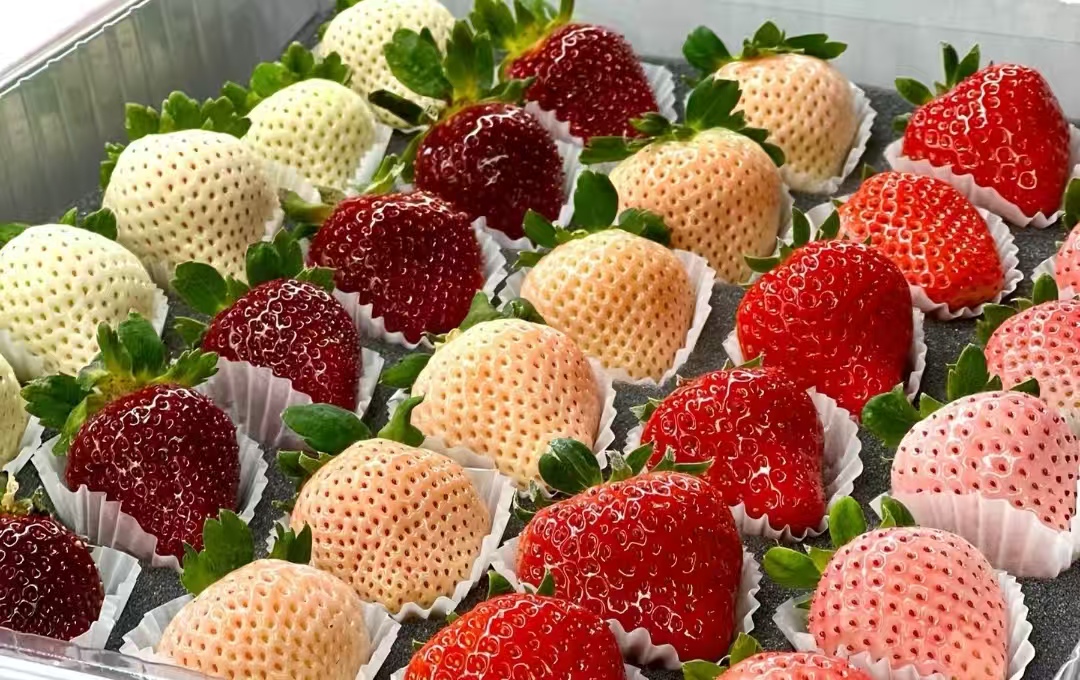 再说说草莓的颜色,不同颜色的草莓,其实是“花青素”在搞鬼。我们平时看到的草莓颜色有深有浅,就是因为果实里积累的花青素数量不一样。花青素是对身体好的天然色素,草莓颜色越深,花青素就越多,比如那些红得发亮、颜色醇厚的草莓,吃起来味道通常更浓郁。而现在很火的白色草莓,不是没熟,而是它的基因决定了没法积累花青素,所以果实是白色或淡粉色的。这种白草莓吃起来偏清甜,酸味比较淡,风味很特别,一点也不比红色草莓差。