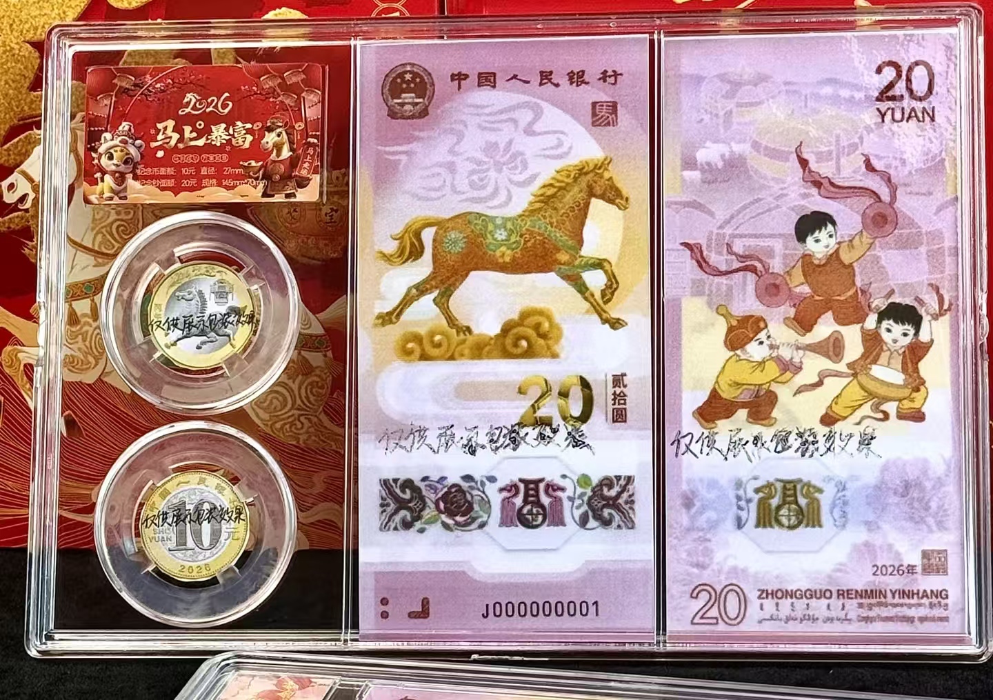 更关键的是,这次发行的马年币钞是第二轮生肖系列的最后一款。对长期收藏的人来说,集齐这一套,就完成了十二年一轮的生肖收藏“大满贯”,这种“凑齐整套”的执念,让它成了必抢的“收尾藏品”。再加上币钞本身的设计也很有看点:纪念币融合了剪纸、年画元素,还印着“丙午”干支字样;纪念钞是塑料材质,有光变面额数字、动感透明视窗这些特别工艺,看着有质感,就算不是收藏爱好者,也愿意为这份“国家工艺美感”买单。