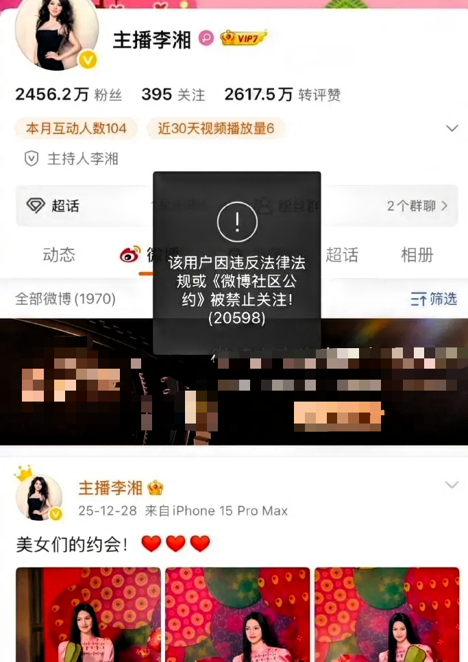 1月16日,主持人李湘名下的多个账号在多个平台同时出现功能受限情况。目前其账号页面均显示无法被关注,其中某平台提示因违反相关规定被设置为禁止关注状态,另有平台虽然未说明原因,但客服均强调无法查询他人账号的具体限制缘由。值得注意的是,她的账号历史内容尚未被隐藏或移除。