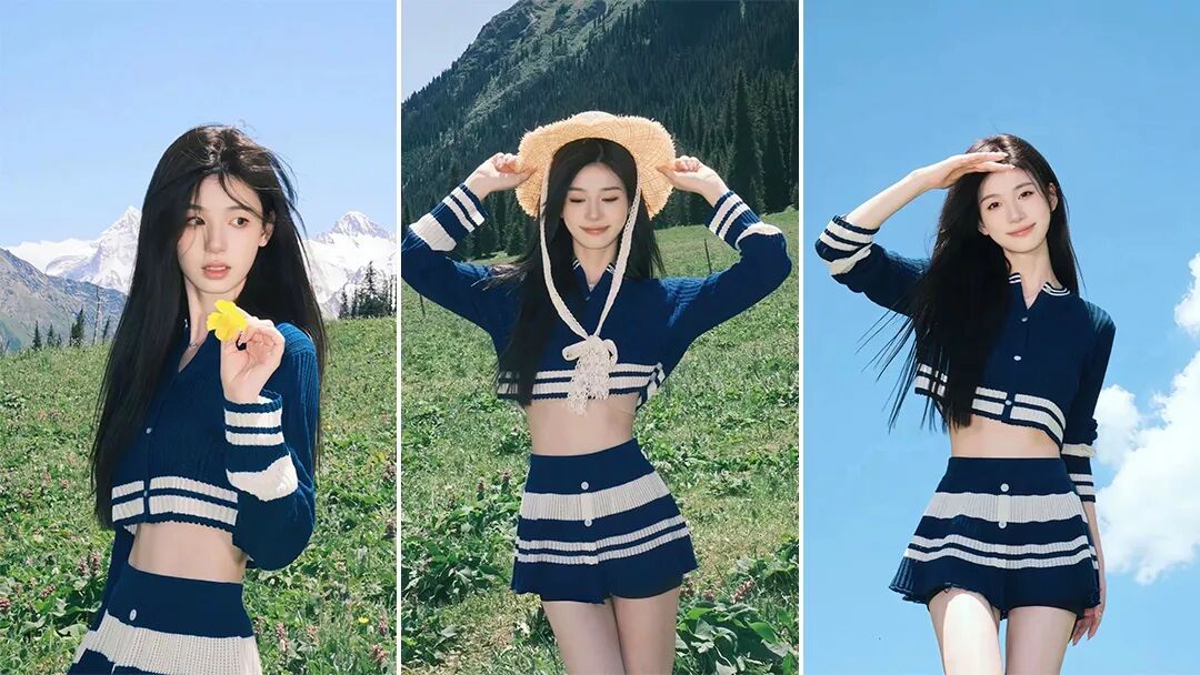 以澄澈蓝天为背景,单手举在额前做遮阳状,手肘自然弯曲,另一只手轻轻垂在身侧。这个姿势简洁又出片,用手部动作营造出与环境的互动感,还能悄悄凸显身材比例。蓝天的纯净感把人物衬得格外清新,仿佛是从画报里走出来的少女,画报感瞬间拿捏。