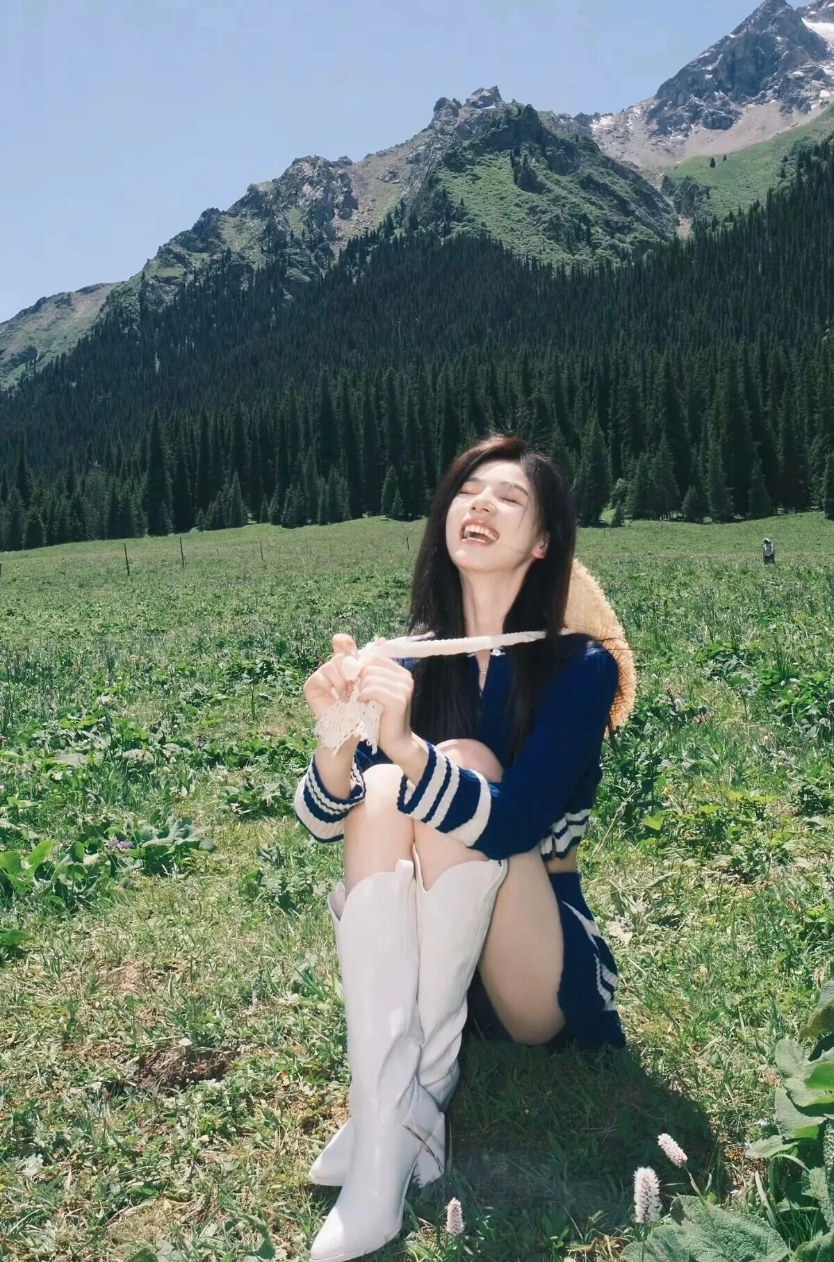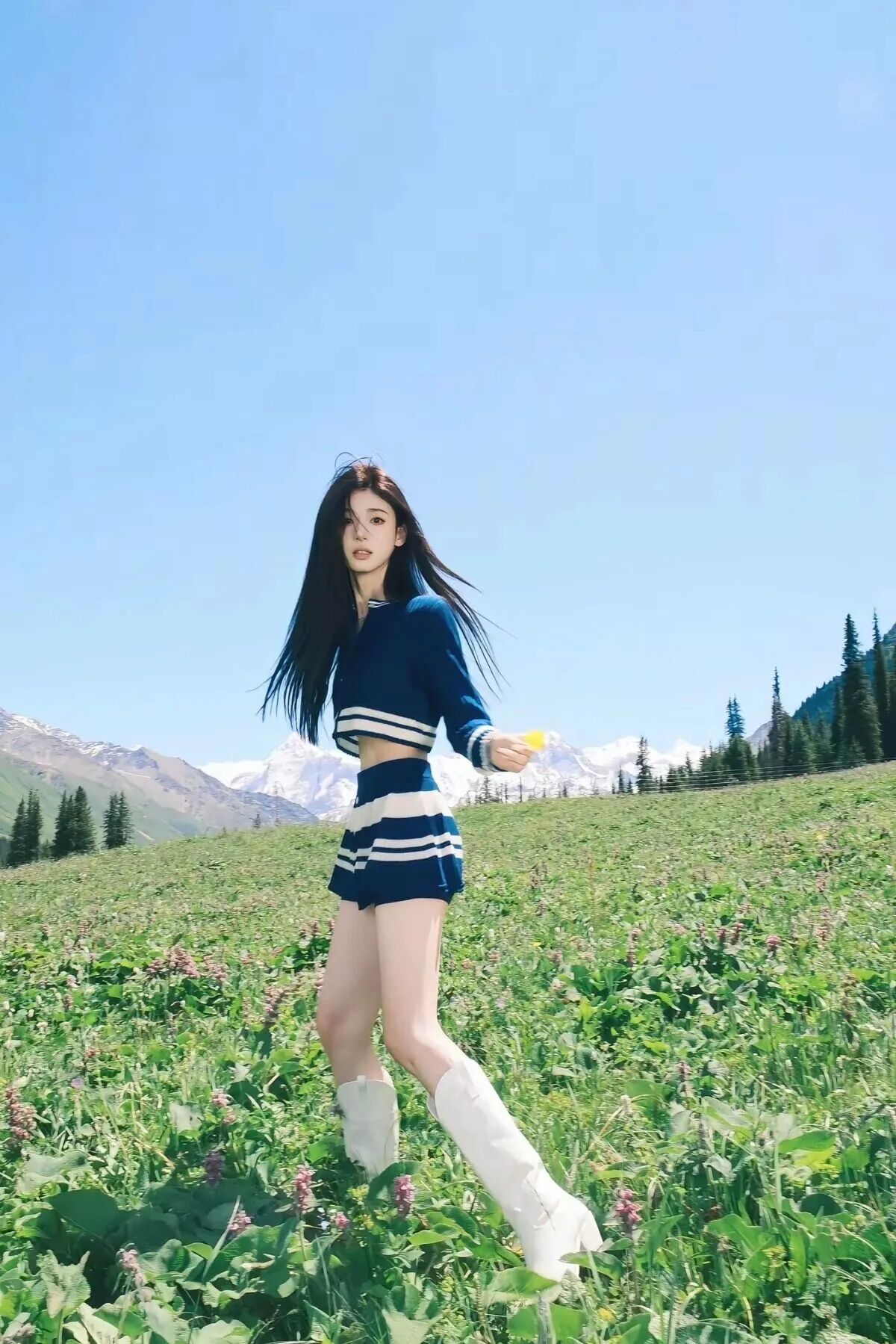 在草地上自然迈步,让长发随风飘动,一只手自然摆动,另一只手轻握小花。行走的动态感打破静态沉闷,小花作为道具又添了几分清新灵动,再搭配远处的雪山背景,故事感直接拉满。走的时候注意步伐自然,眼神可以看向远方或镜头,“不经意的美”就这么被捕捉到了。