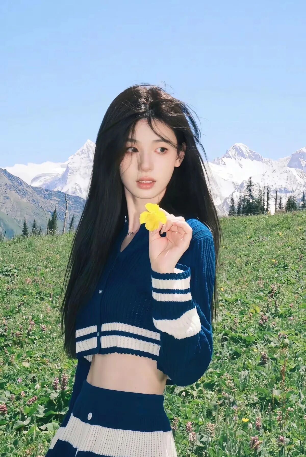 手持一朵黄色小花,将花靠近镜头,自然地放在胸前或侧方,眼神温柔地看向镜头或远方。小花作为焦点道具,既点缀了画面,又能引导视线聚焦到面部神态,搭配背景的雪山草地,清新感扑面而来。这个姿势很适合近景特写,突出眉眼细节和手部的细腻感,让画面充满柔美感。