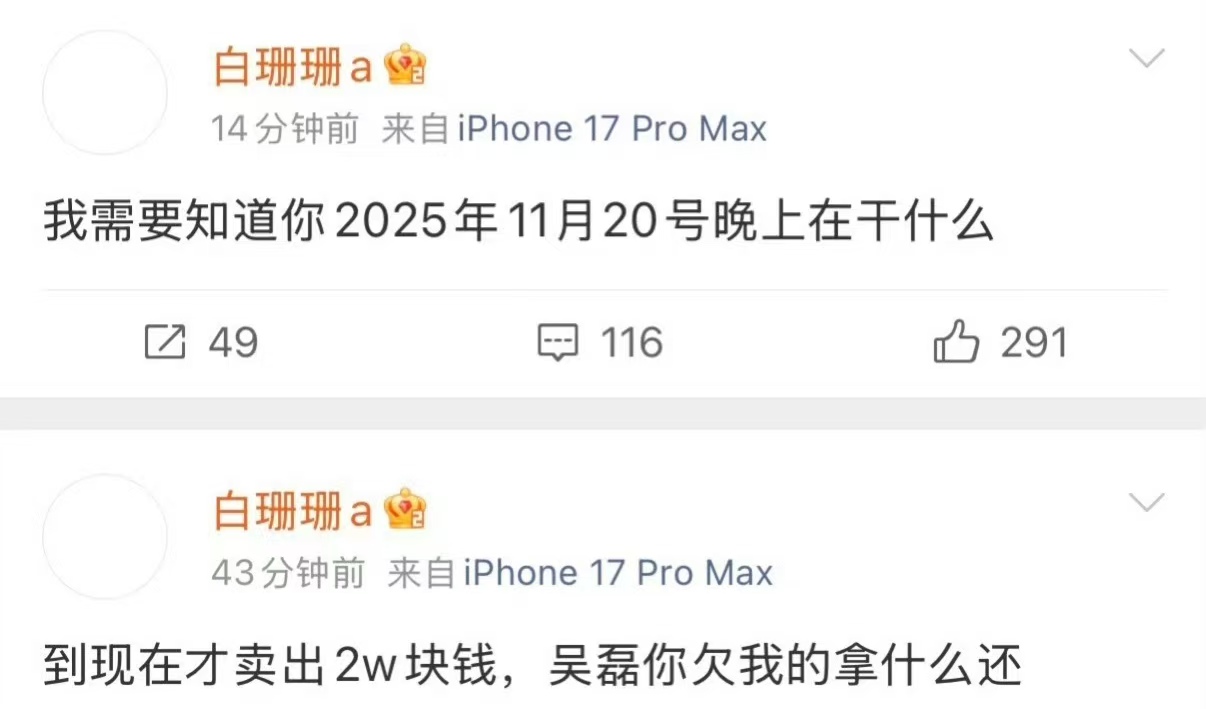 1月18日晚,内娱被一条突如其来的爆料搅得沸沸扬扬。微博用户“白珊珊a”接连发文,先是用“他的床照1万块谁买”制造噱头,半小时后直接点名演员吴磊,喊话“你欠我的拿什么还”,既暗示两人有情感和经济纠纷,又公开叫卖所谓的隐私照片,相关话题很快冲上热搜。