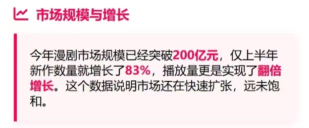 从2025年刚刚起步,到2026年成为现象级风口,漫剧的崛起,充分展现了AI技术与内容产业结合的巨大潜力。它不只是给短剧赛道添了新活力,更靠着工业化的生产能力和新颖的题材空间,开辟出了一条属于自己的道路。随着AI技术不断升级、平台扶持力度加大,以及行业规则逐渐完善,漫剧在2026年突破200亿元市场规模后,大概率还会保持高速增长,和短剧、传统动画等形成多元并存的内容生态。眼下,这场由AI驱动的内容变革还在继续,漫剧的形式和发展边界还在不断探索中,但可以肯定的是,这个新兴内容载体已经站稳了脚跟,正在为内容产业书写全新的篇章。