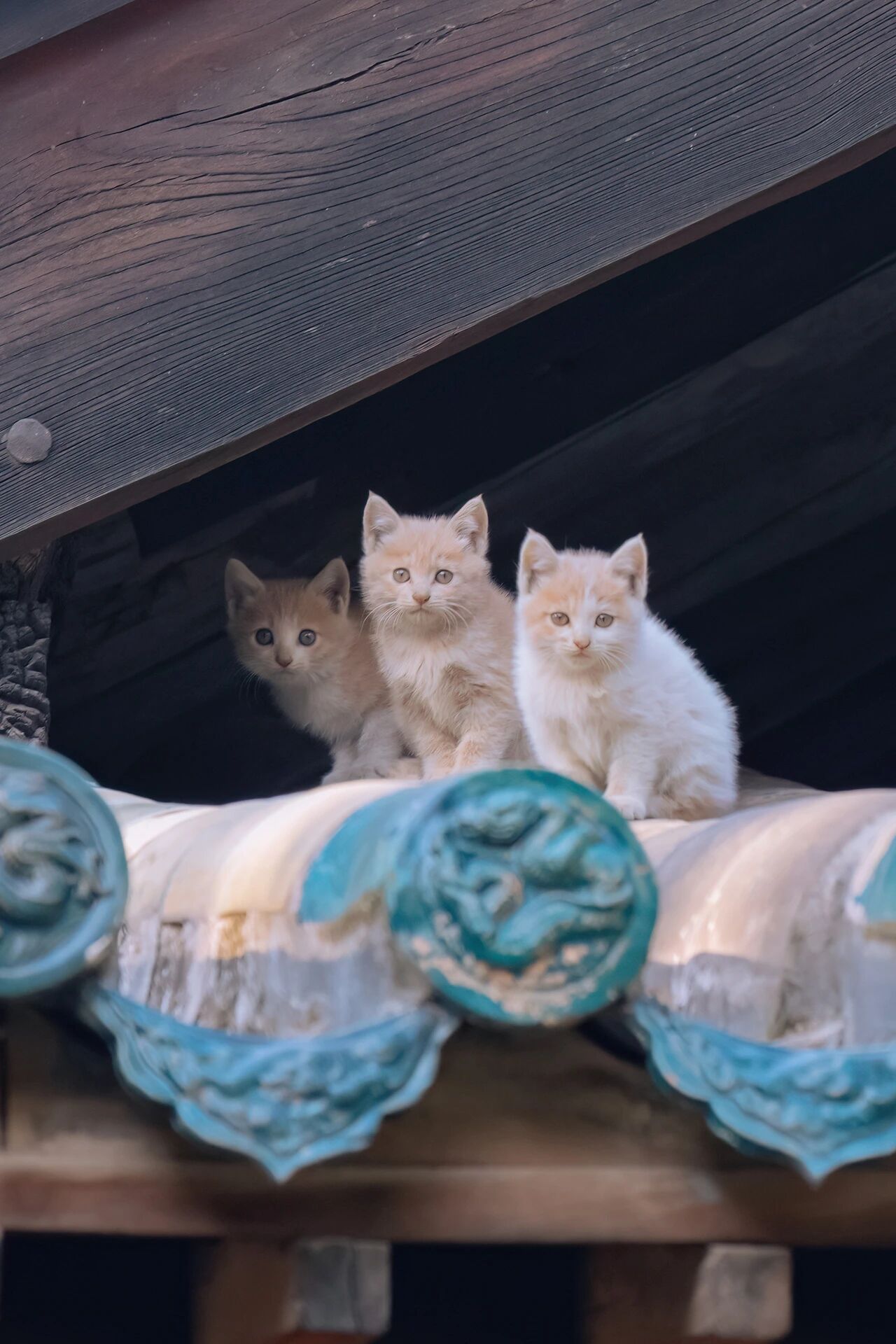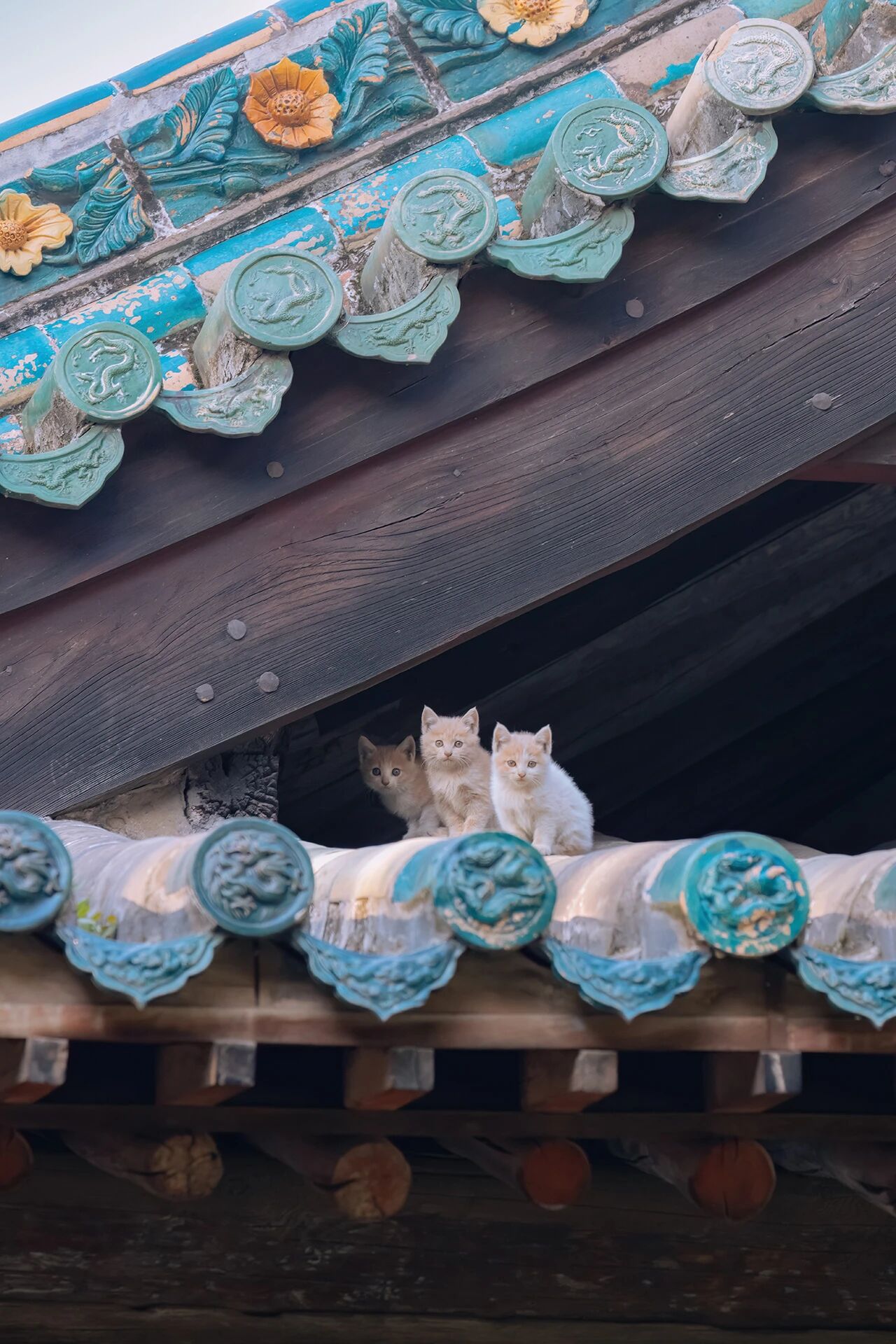 屋檐之上,三只小猫依次探头的画面像是叠在一起的小小身影,憨态可掬,让人忍不住驻足欣赏。这样的偶遇,也让整个古建瞬间增添了几分活泼与生气。