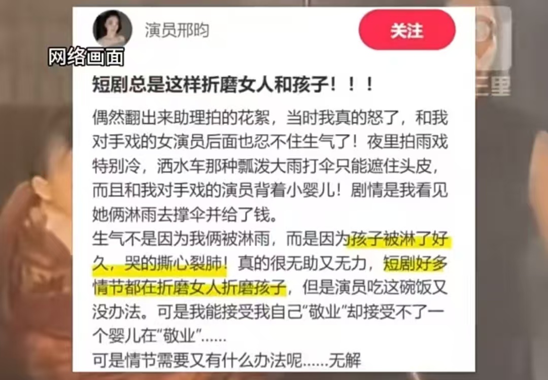 2026年1月17日,短剧演员邢昀的一则爆料在网络上炸开了锅,把短剧行业背后的乱象赤裸裸地摆到了大众面前。在气温逼近零度的冬夜,一个还在襁褓里的小宝宝,被固定在演员背上,硬生生在人工大雨中淋了将近半小时,哭声从一开始的撕心裂肺慢慢变弱,小脸冻得发紫。而这么做的原因,仅仅是剧组想省点换道具的时间,不肯用仿真婴儿替代拍摄。更让人心里发凉的是,这半小时的“遭罪戏”,剧组只给了婴儿800元片酬,这点钱连孩子要是淋出肺炎,看病的零头都不够。