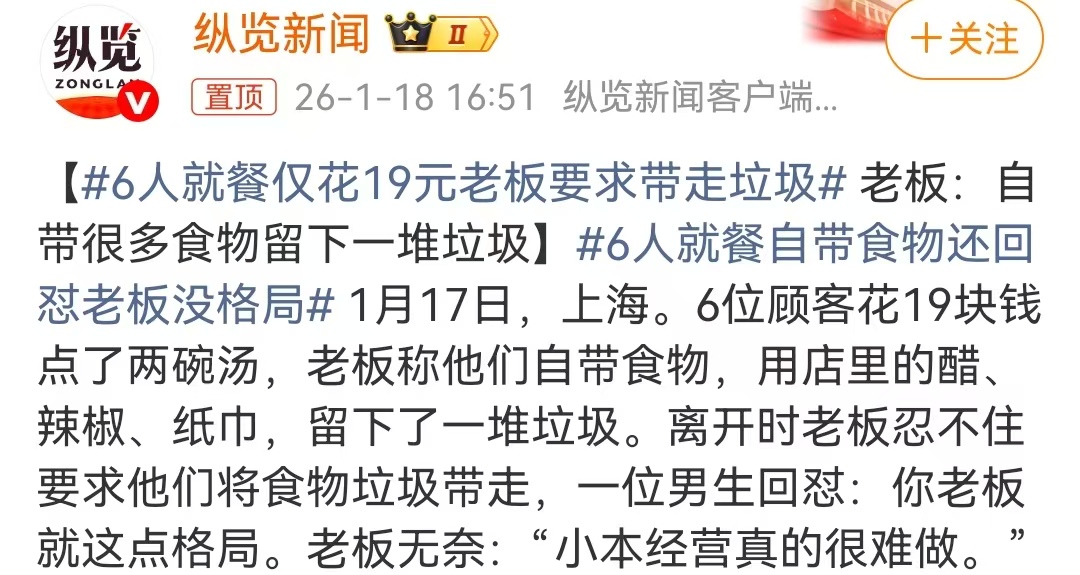 这事说起来不算大事,但里面的道理却值得琢磨,很难简单评判谁对谁错,核心还是双方站的角度不一样。在这几位顾客看来,自己既然在店里花了钱,用点醋、纸巾这些配套用品是天经地义,垃圾留给店家清理也是分内事,老板主动要求带走,反倒显得小家子气,所以才会用“格局”来反驳。可他们没多想,19元就点了两碗汤,店里的这些耗材看着不值钱,但对小本生意来说,都是日积月累的成本。更关键的是,这堆垃圾大多来自他们自带的食物,并非店里消费产生,老板清理起来还要额外花时间、费精力,本来利润就薄,这些无形的消耗只会让盈利空间更小。