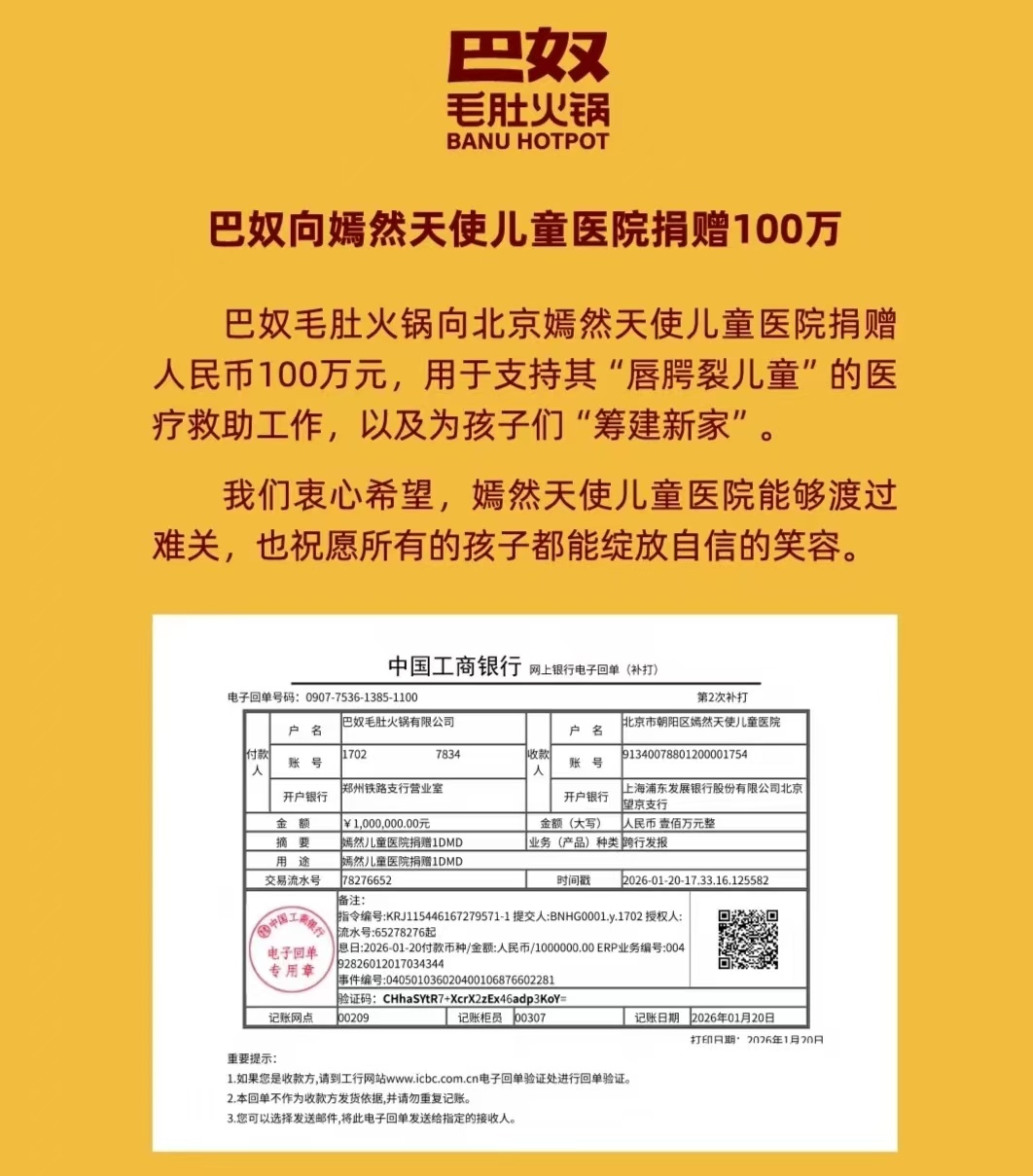 1月20日,巴奴毛肚火锅官方宣布,向北京嫣然天使儿童医院捐赠100万元。这笔钱将专门用于唇腭裂患儿的医疗救助,同时助力医院为孩子们“筹建新家”,给正陷入运营困境的公益医疗事业添了份实在的暖意。眼下,嫣然医院因房租纠纷遭遇经营难题,招牌虽已摘下,但院内还有20多名唇腭裂患儿等着做手术。巴奴的这笔捐助来得正是时候,像寒冬里的暖流,既为孩子们的康复带去希望,也帮医院缓解了存续压力。