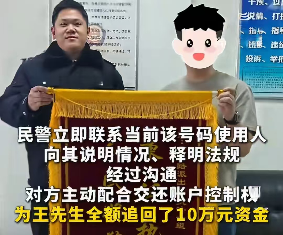 情况紧急,民警马上根据线索找到了这个手机号的现任使用人,第一时间打去了电话。电话里,民警把事情的来龙去脉讲清楚,还耐心普及了相关法律知识,明确告诉对方,占用别人的微信账号、动里面的钱,是要负法律责任的。经过民警的劝说,现任号主也意识到了问题的严重性,主动配合把微信账号还给了王先生,这场十万块的财产危机总算有惊无险地化解了。事后,王先生特意给派出所送了锦旗,感谢民警快速出手,帮他保住了积蓄。