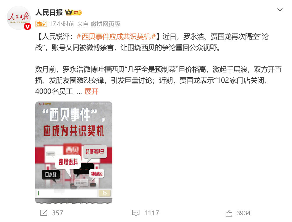 人民日报三评西贝,点名罗永浩:可以批评但得讲清