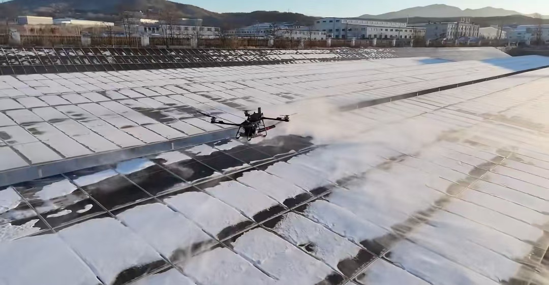 在光伏电站,积雪会影响发电效率。新疆的光伏电站用的扫雪无人机,一次能清500平方米的雪,效率是人工的5倍多,就算零下40度的极寒天气也能正常工作,还能大幅降低运维成本。在桥梁、山区道路这些关键路段,无人机能精准喷洒环保融雪剂,15分钟就能完成3.4公里的融雪任务,比人工快4倍,还不用人上路冒险。