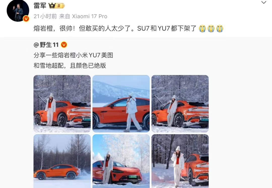 1月24日晚,小米创始人雷军一条关于汽车配色的微博引发热议。他在文中直言小米汽车熔岩橙配色“很帅但是敢买的人太少了”,同时正式宣布,小米SU7和YU7两款车型已同步下架这一配色。在评论区,雷军还感慨道“一款车漆,好看而且大家都敢买,实在太难”,一句话道出了车企在颜值设计与市场需求之间的两难。
