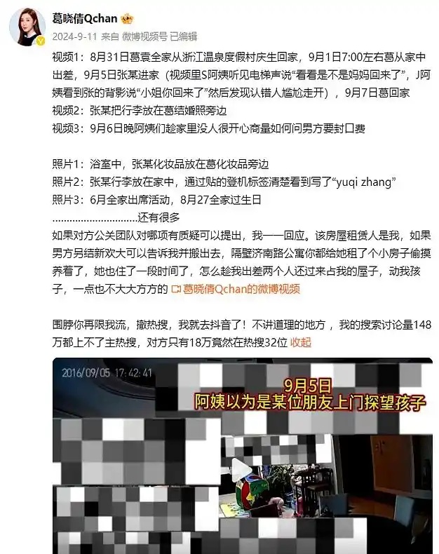 葛晓倩还回忆,在自己被威胁之前,曾多次在网络上公开表达对张某的不满。她提到,早在2016年,她通过家中监控画面发现,在自己与袁巴元尚未办理离婚手续的期间,张某多次出入其婚内住所,与家中的子女、保姆共同相处。葛晓倩认为,这一行为已经严重影响了自己的婚姻关系,因此当时便公开发文指责张某介入自己的婚姻生活。