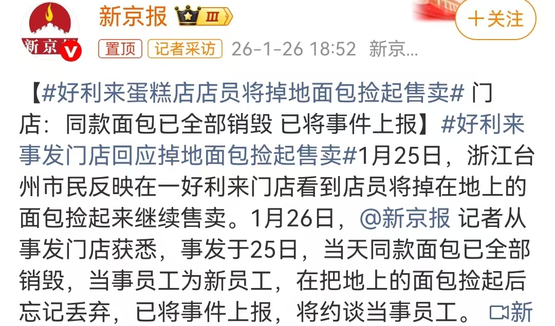 如今,消费者愿意为好利来的产品支付比普通烘焙店更高的价格,看重的不仅是精致的外观和口感,更信赖其品牌背书的食品安全。而一块掉在地上的面包,不仅触碰了食品安全的底线,更击碎了品牌与消费者之间的信任纽带。