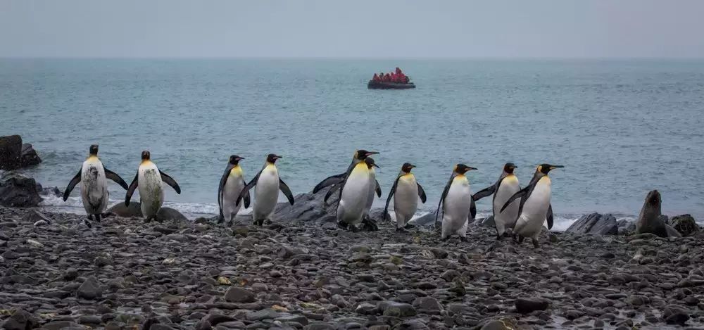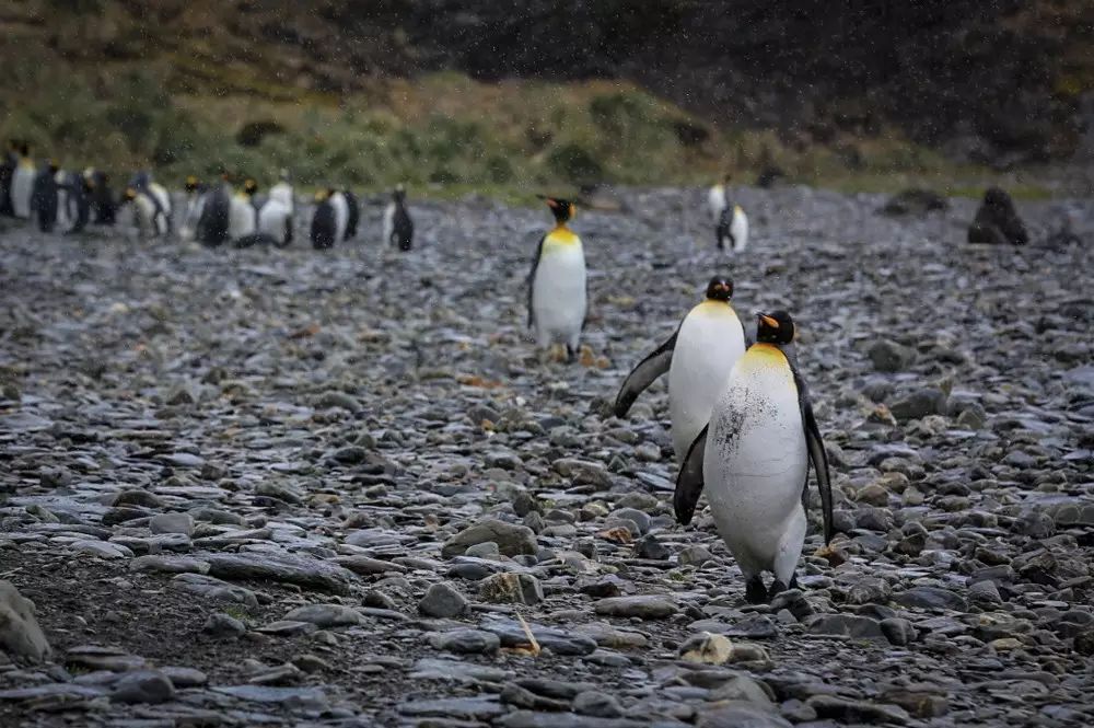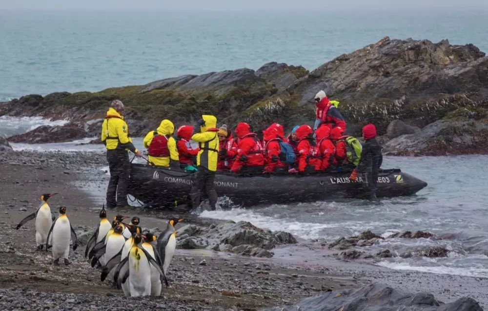 金港湾也是一个较大的王企鹅繁殖栖息地,据统计每年约有25000对王企鹅来到这里繁殖。这里还是主要的象海豹繁殖地,经探险队员登岛探路,今天风浪太大,冲锋舟一次只能载6个登岛。