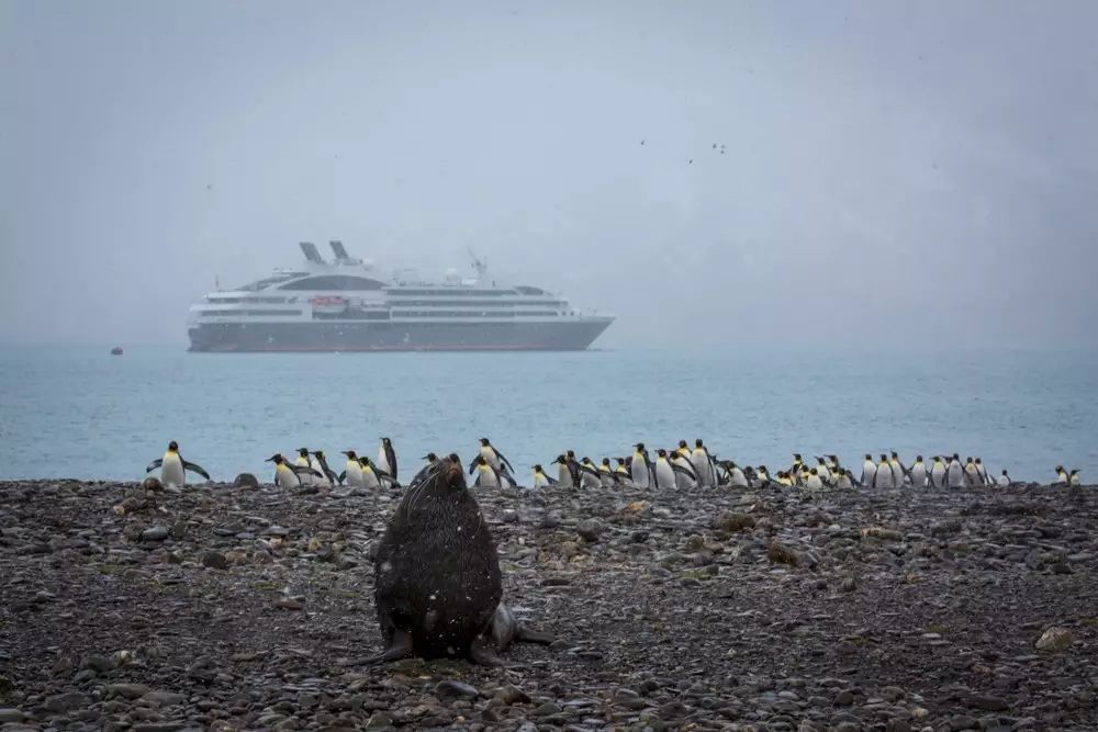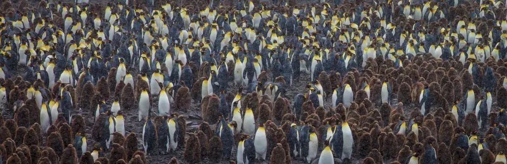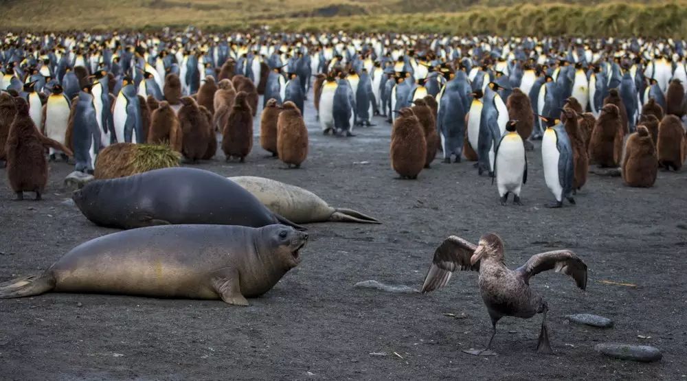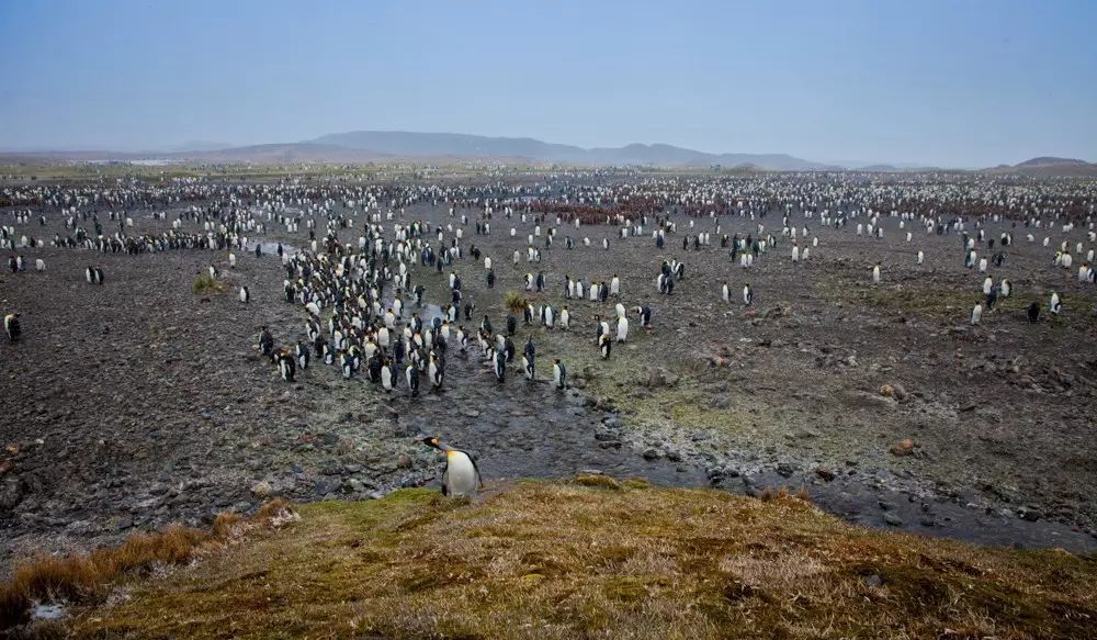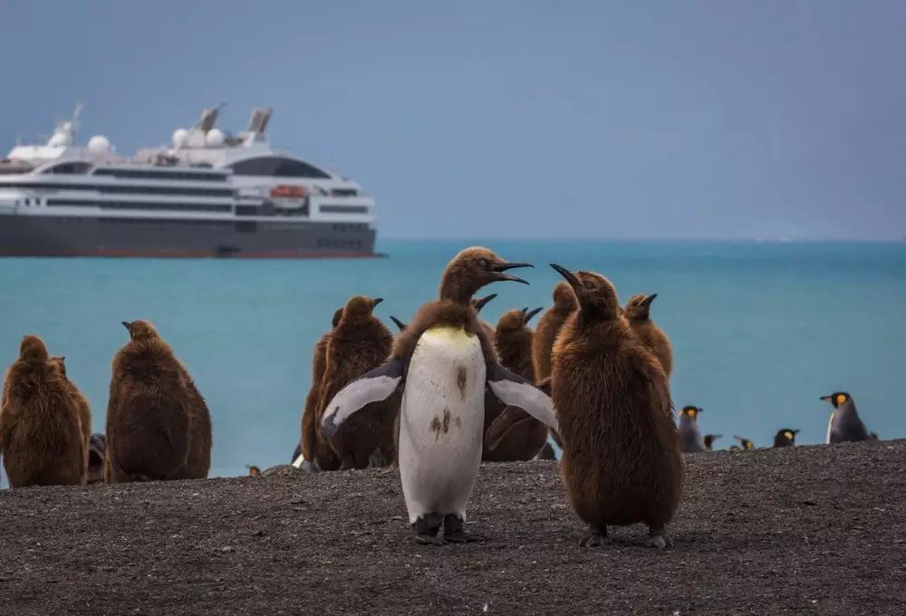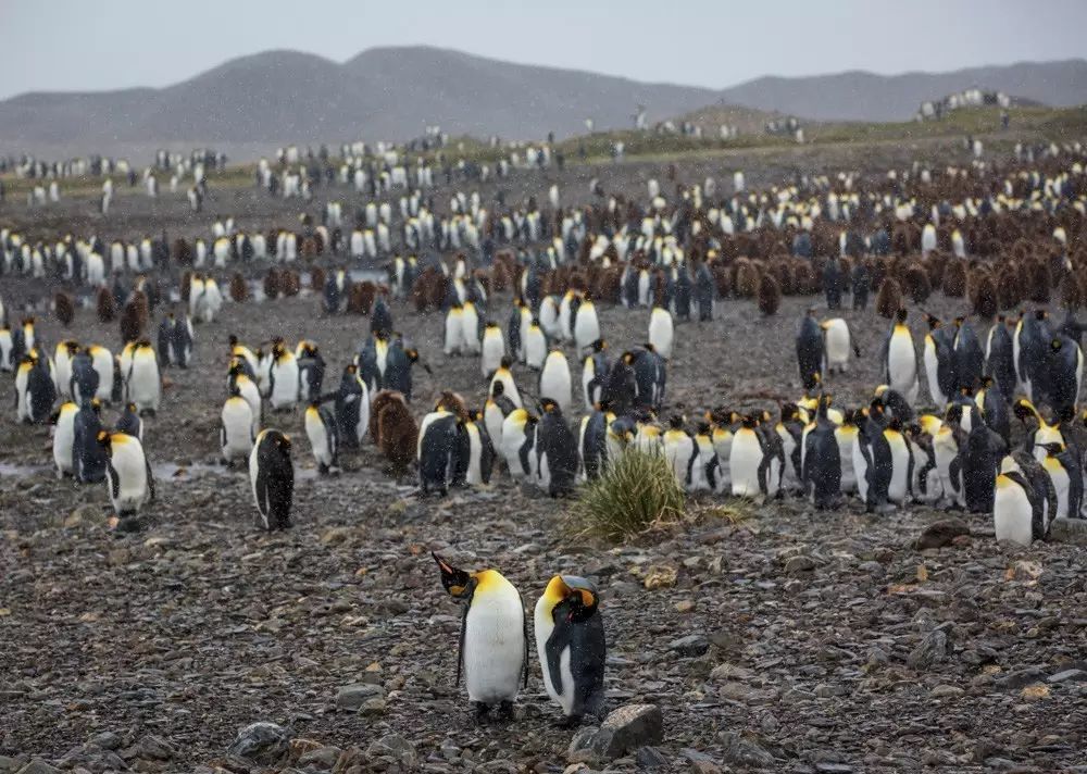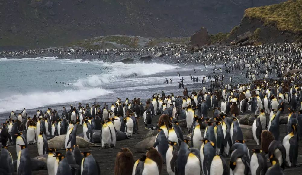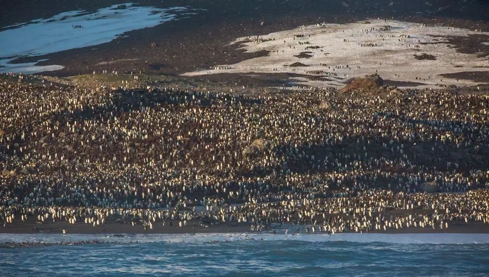 我们登陆的这个311平方公里的冰雪世界,是动物的乐园。这里也是王企鹅主要的栖息地,每一个港湾都有几万或几十万只企鹅在唱着歌,似乎在欢迎我们。看着这海滩上漫山遍野密密麻麻的企鹅,看着成片的海豹、海象、海鸟,我惊呆了!