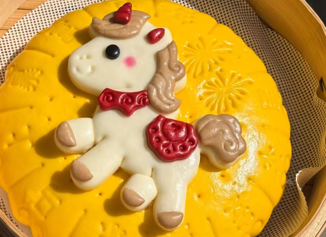 在郑州中原区、金水区的多家手工花馍门店,眼下都是一派忙碌景象。操作台上,工作人员忙着揉面、塑形,用南瓜汁、紫薯泥、菠菜汁调出来的彩色面团,经过巧手揉捏、模具压形、拼接点缀,一个个憨态可掬的小马花馍很快就成型了。有的小马昂首挺胸,寓意“马到成功”;有的怀里抱着红枣,象征“早纳福禄”,配色喜庆又精致。