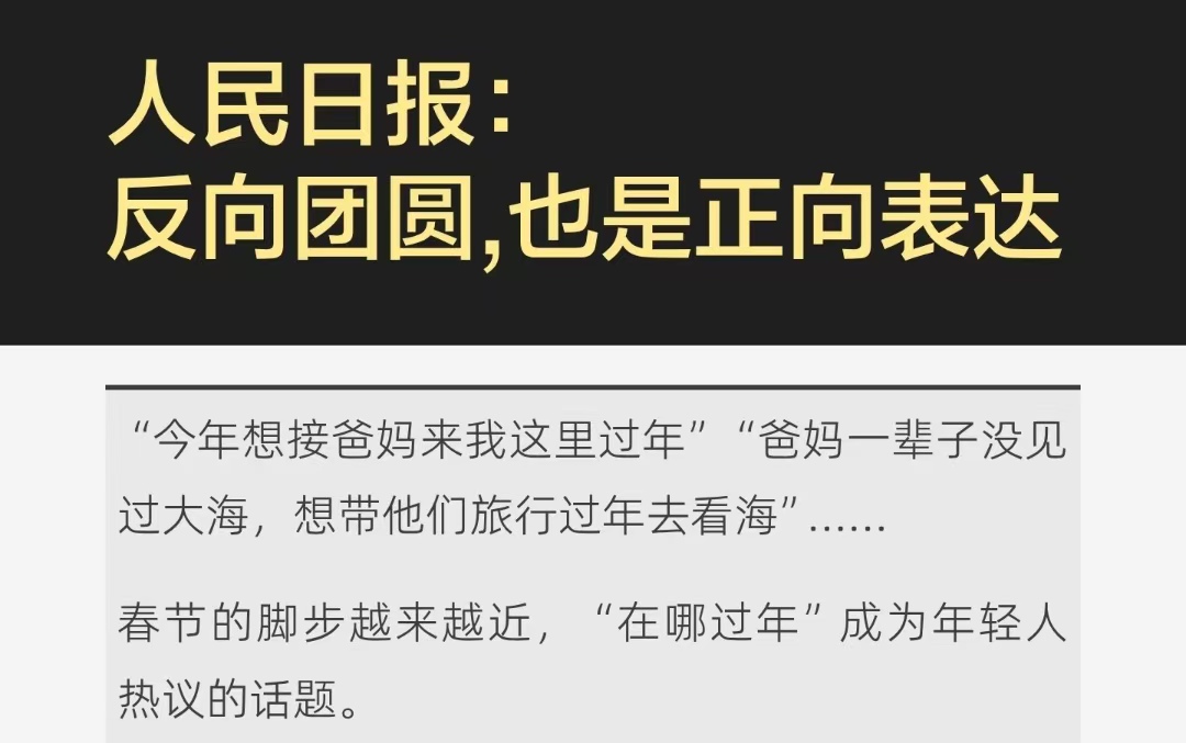 这种新的团圆方式,不仅解开了年轻人“想团圆又怕奔波”的难题,也体现了新时代的孝道——不再是“父母在,不远游”的刻板坚持,而是“游必有方,念必有归”的贴心陪伴,是长辈和子女之间双向的体谅和珍惜。