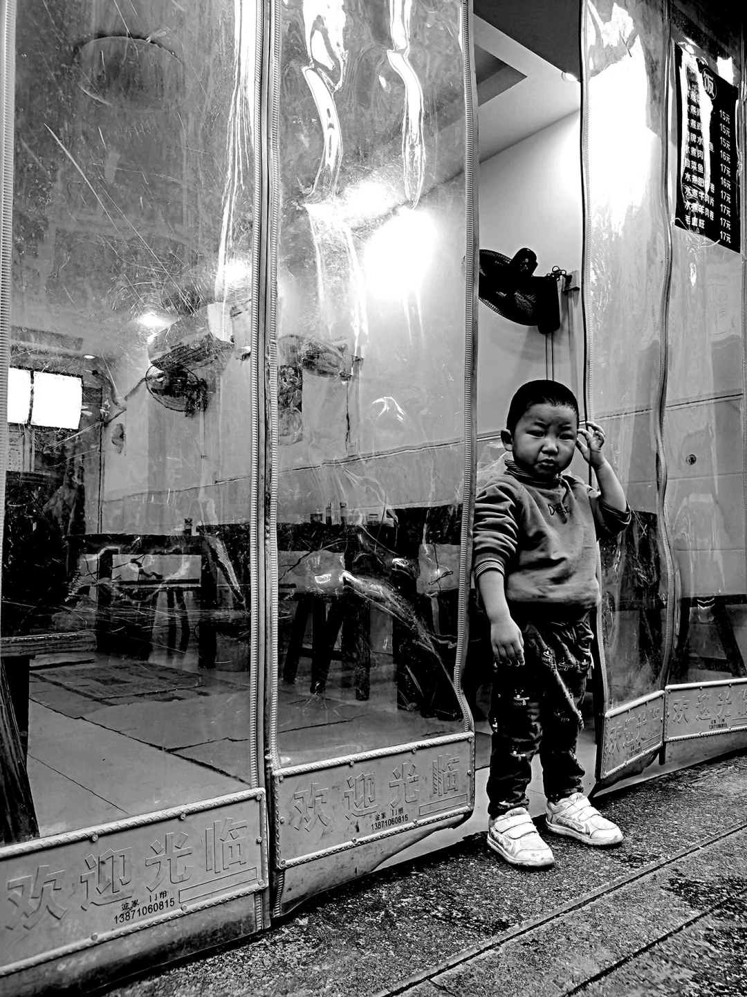 点评:平凡景观往往会因为人物的独特情态而展露出趣味的一面。在这张照片中,小男孩在门口摸脑袋的瞬间情态,结合其所处的场景特征,为观者营造出了可供联想的情节空间,使人物形象更加立体生动。