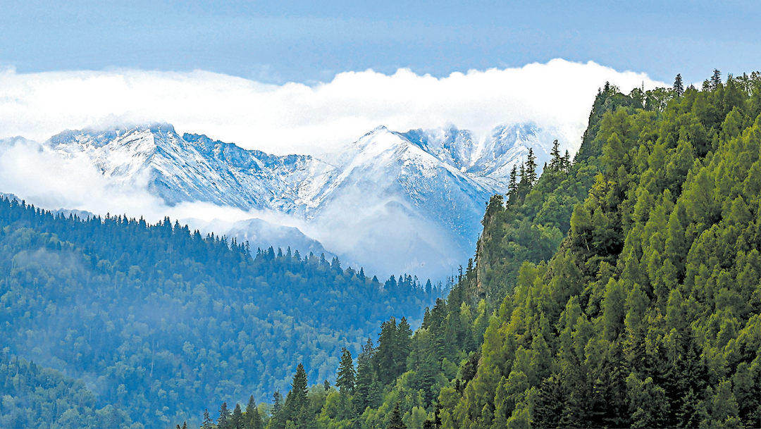 点评:此片捕捉到山林与雪山在云雾氤氲下的独特景致。云雾的形态与位置恰到好处,似轻纱般缠绕山峰,赋予画面灵动感,这一自然瞬间难以复制。色彩搭配独特,翠绿森林、银白雪山与湛蓝天空组合,形成强烈的视觉张力,展现出大自然的和谐与美妙。