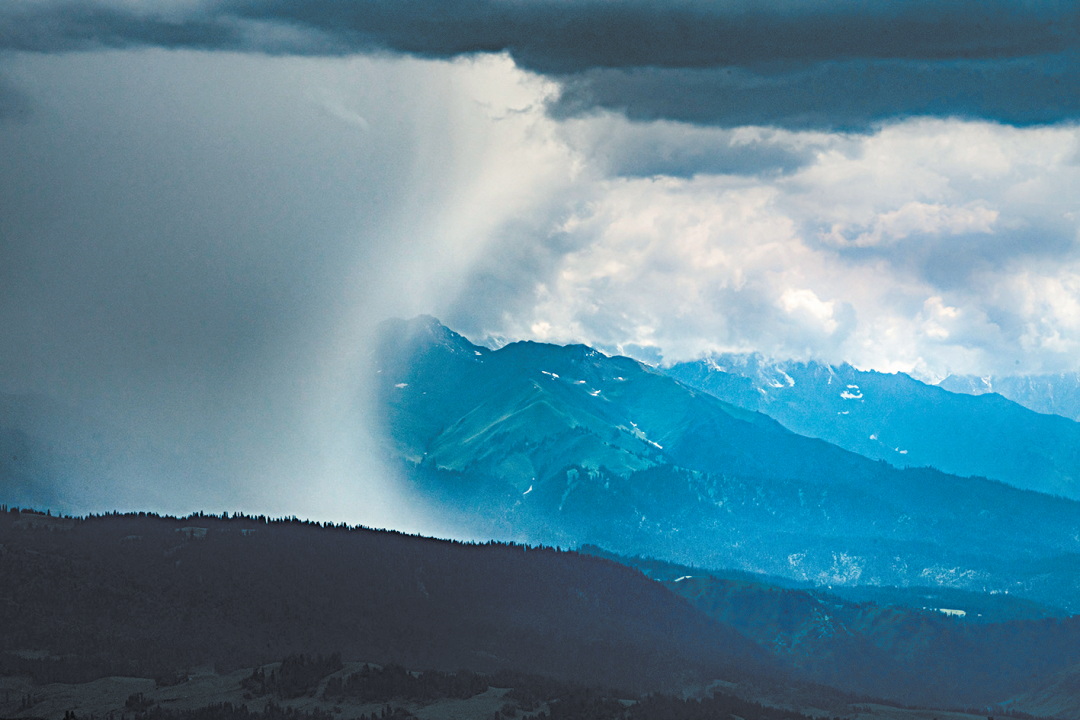 点评:独特的天气往往可以得到独特的画面。在层叠的山脉间,雨幕连接天地,一半烟雨一半晴的独特情景被作者生动呈现。动静虚实的不同情势和统一的蓝色调效果赋予画面视觉张力。