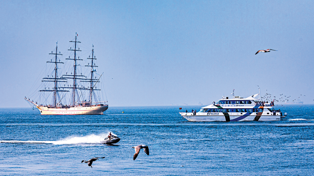 点评:取景角度独特、恰当,充分利用了宽阔的水面和相对简洁的天空形成上下呼应之势,两侧的建筑左右均衡,正面飞来的鸟群展现出节奏感,体现出生机活力,彰显了主题特征。