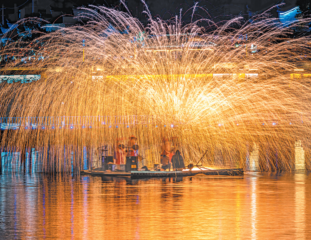 点评:铁花飞溅形成的明亮痕迹在作者的慢速快门下展现出独特的样貌,如同盛放的火花般吸引人心,加之水面倒影的衬托,进一步渲染了现场的光色氛围和快乐气息。人物形象的点缀彰显了传统民俗的内涵。