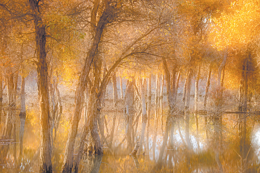 点评:画面展现出画意的美感特征,尤其是柔化后的朦胧效果赋予画面独特性,充满吸引力。侧光照明产生的明暗节奏增强了树木的立体形态和排布特征,水面的倒影以及富有层次的色彩让画面效果更加妙趣横生。