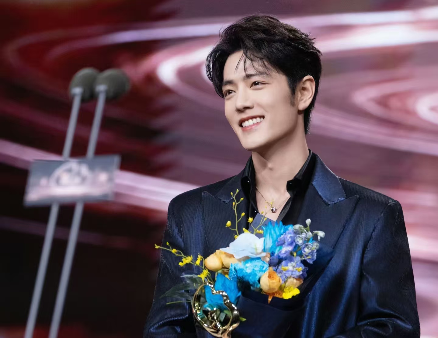 领奖时,肖战穿着一身酒红色西装,身姿挺拔、气质沉稳,走上舞台的那一刻,全场掌声不断,直播间的观看人数也瞬间达到峰值。这份荣耀绝非偶然,而是他多年来脚踏实地拼出来的。