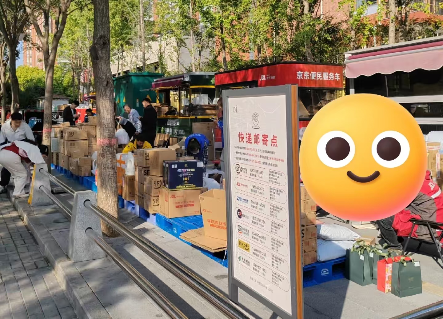 店内热火朝天,店外也丝毫不逊色。在胖东来门口,近十家快递摊位一字排开,撕拉胶带的声音此起彼伏,成为春节前最特别的“忙碌声”。快递小哥们身着工装、头戴头盔,打包、称重、扫码、贴单,一系列动作娴熟麻利,手上的活从来没有停过。他们的摊位前,包裹堆得像小山一样,有包装精美的年货礼盒,有新鲜的生鲜果蔬,还有各式生活用品,每一个包裹里,都装着大家对新年的期盼和对亲友的牵挂。