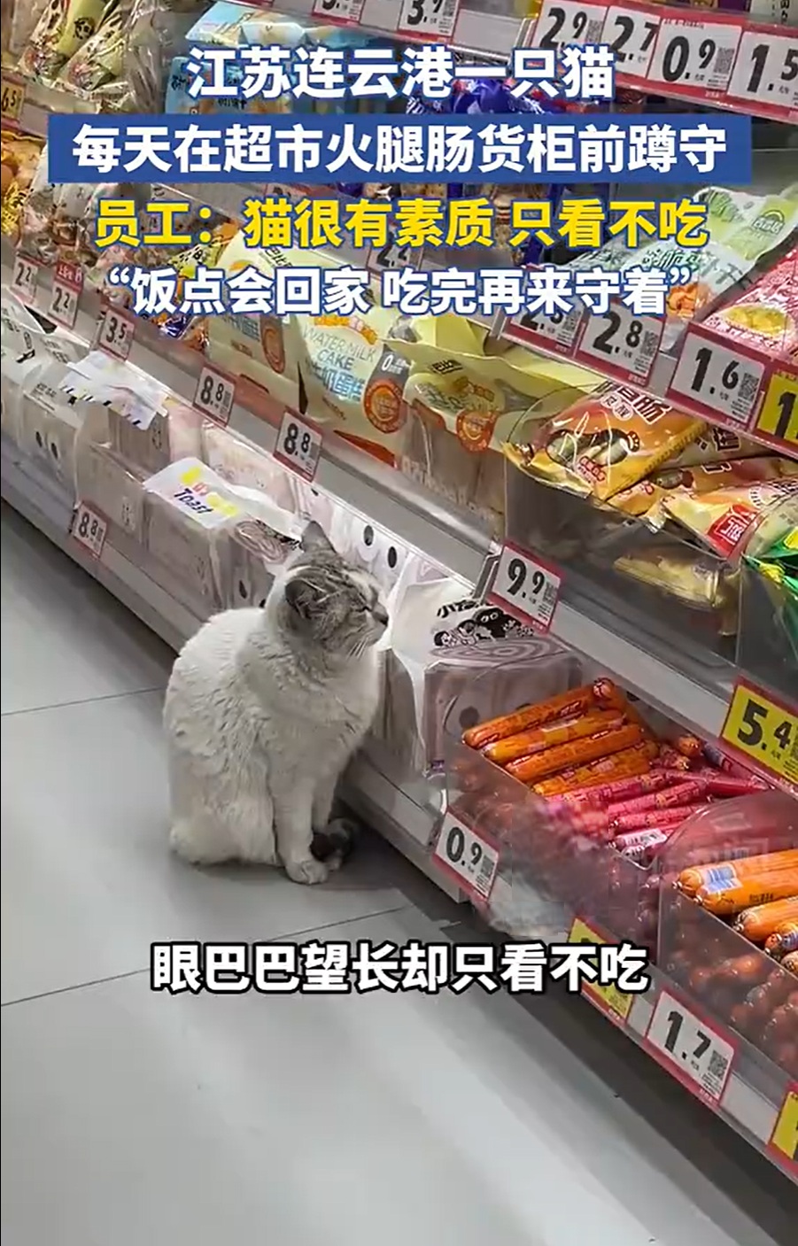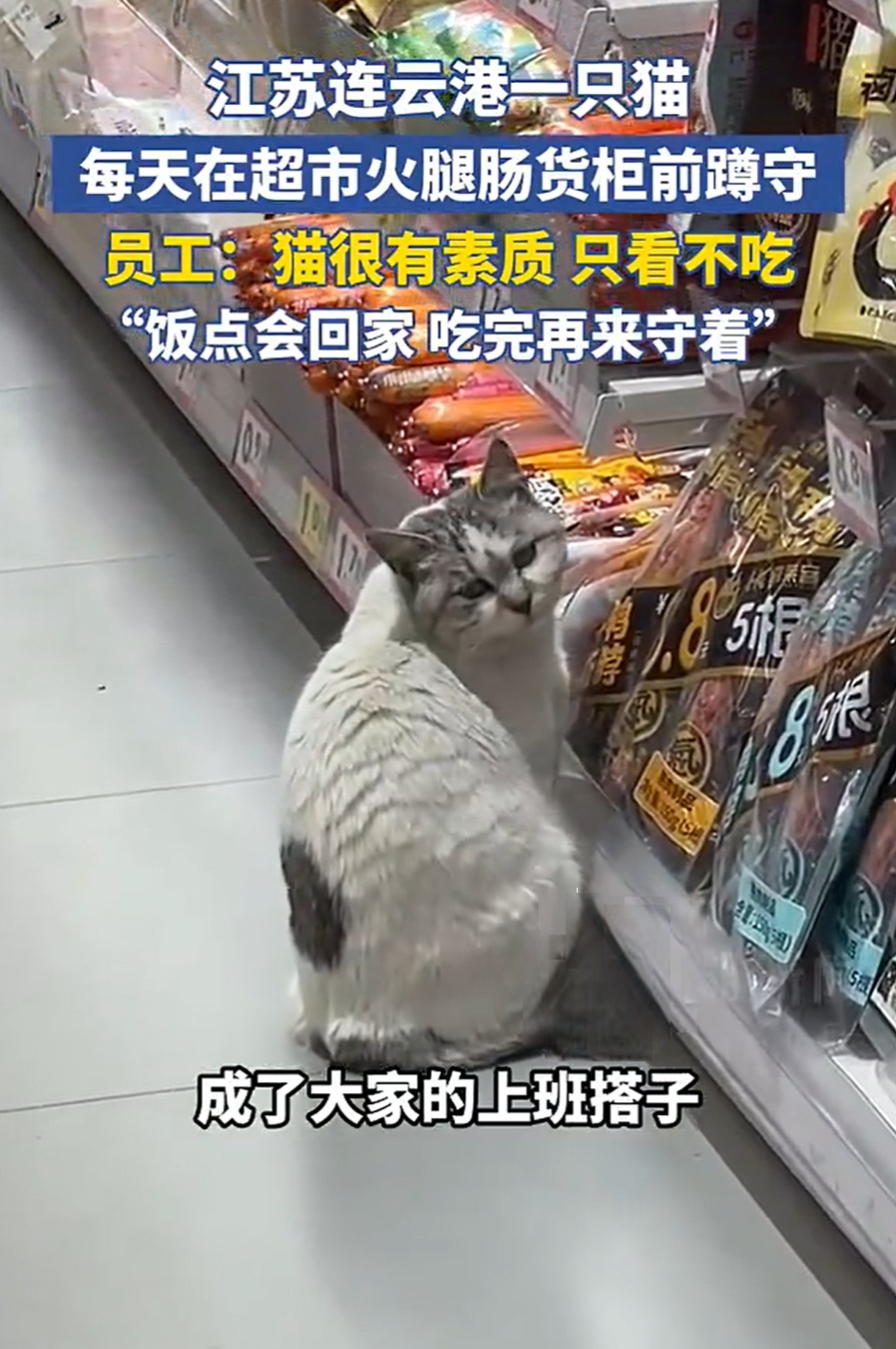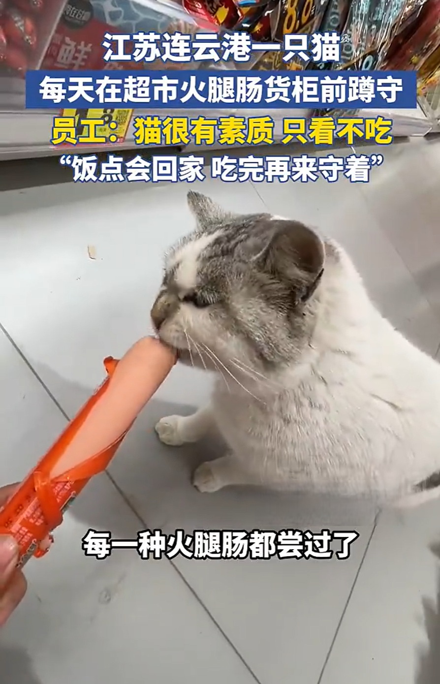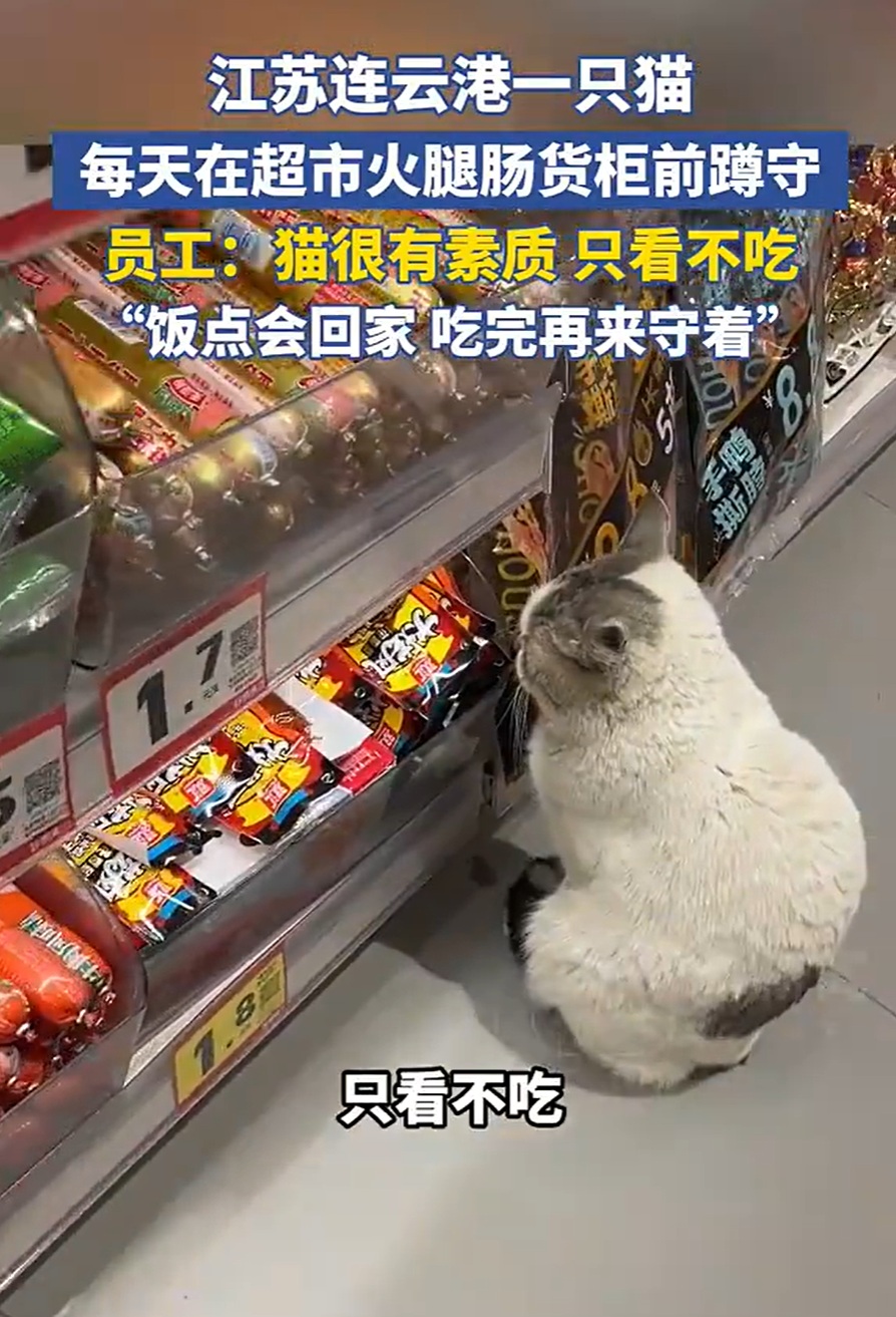 近日,江苏连云港一家超市里的一只邻居家猫因常年固定蹲守在火腿肠货架前,引起不少顾客关注。根据店内员工介绍,这只猫每天都会按时来到超市,找到火腿肠区域后安静坐好,看着一排排包装整整齐齐的食品,一坐就是好几个小时,但从不做出抢食或抓挠的举动。员工形容它非常有礼貌,只是看,不会主动去撕开,也不会干扰来往顾客的选择。