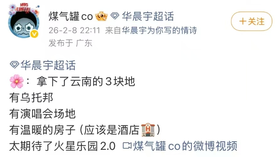 值得一提的是,这个乐园并不是华晨宇单方面的“馈赠”,而是他和粉丝一起共创的。他在官宣时反复强调,“火星从来不是我一个人的,是所有陪伴者共同的家”。