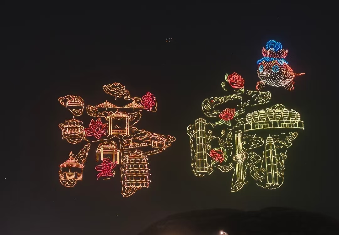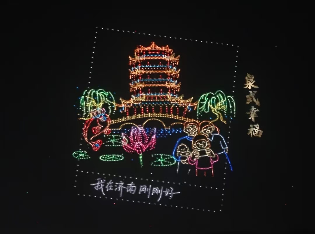 表演快结束时,无人机画出了济南的市花图案,还有“泉在济南”“一马当先”的字样,搭配着璀璨的光影,把现场气氛推向了高潮。这不仅是一场好看的表演,更是对济南市民的新春祝福,也展现了济南这座千年古城的活力。