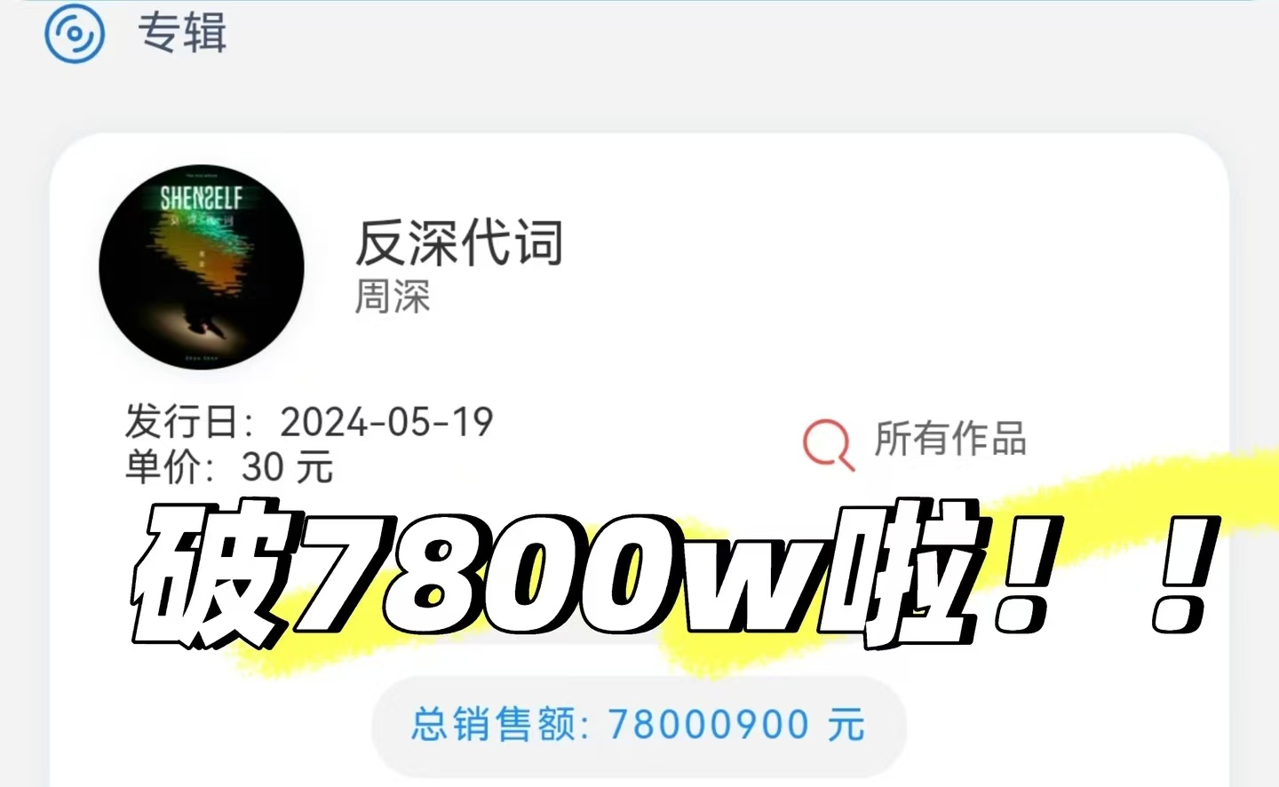 在限购的大背景下,《反深代词》能突破7900万销售额,不光是数字好看,更能看出周深的音乐魅力有多强,粉丝的凝聚力有多足。从专辑发行当天开始,销量就一路飙升,之后也一直稳步增长,每一笔销售额,都是听众对周深唱功的认可,也是对他多年深耕音乐、不敷衍每一首作品的回馈。