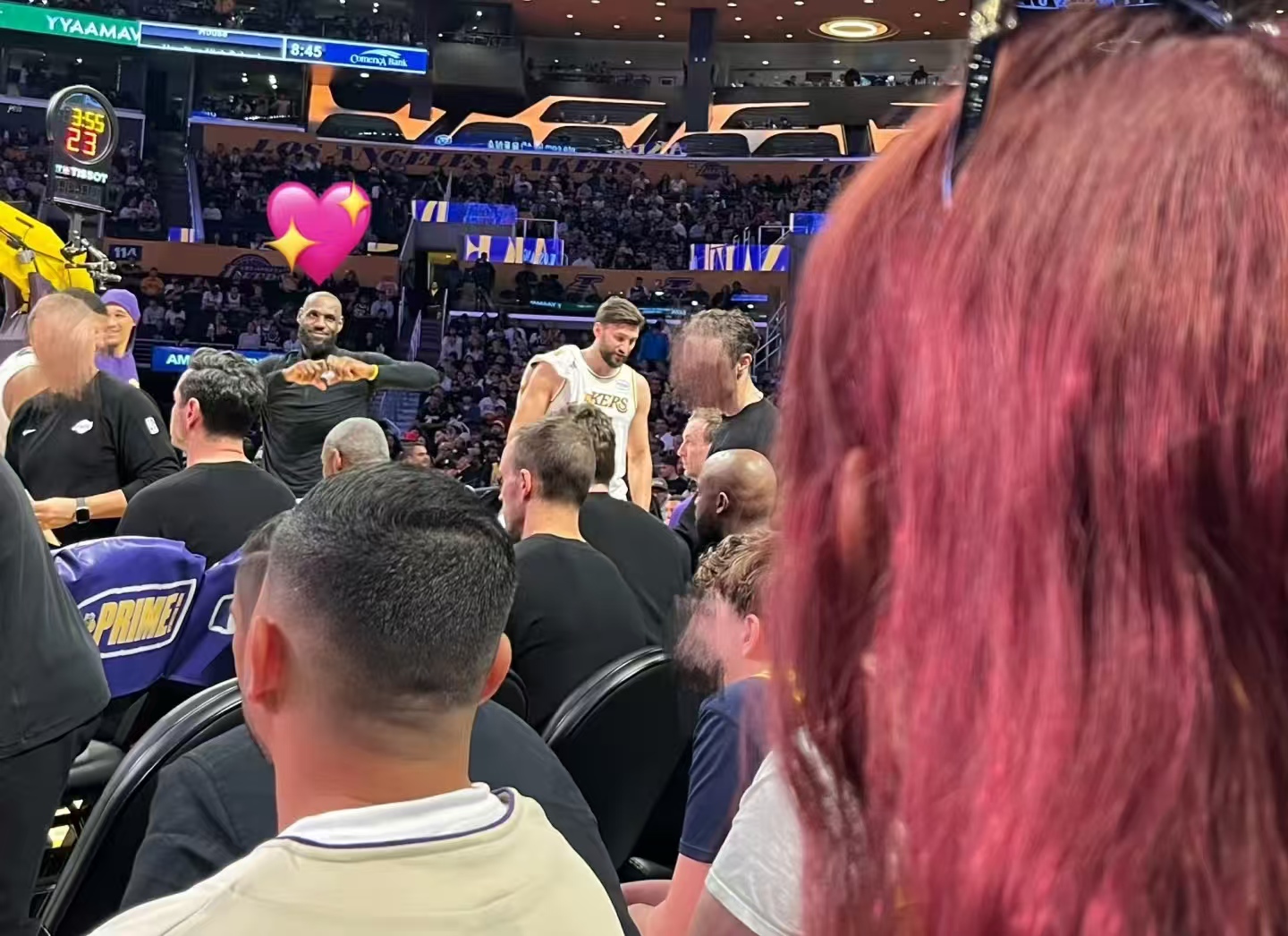 或许是这份热忱太过显眼,比赛进行中,勒布朗·詹姆斯竟然注意到了这位远道而来的中国粉丝。他朝着宋雨琦的方向,缓缓比了一个心,还顺带眨了一下眼,温柔又宠溺的动作,被现场镜头精准拍了下来,瞬间刷屏网络。