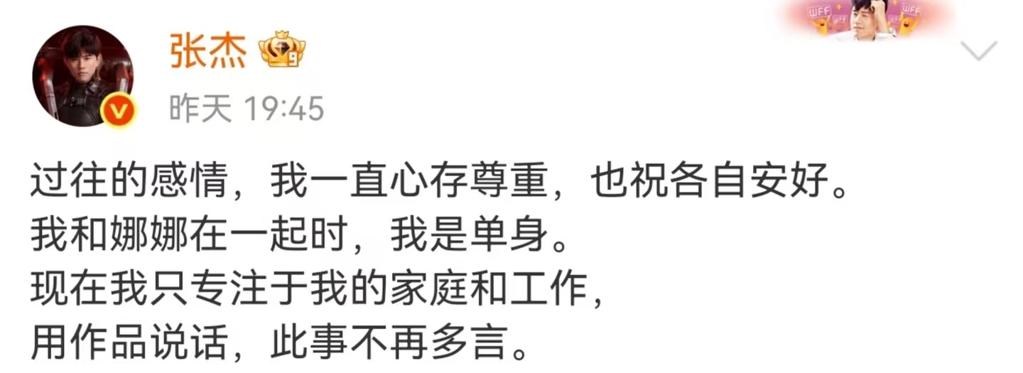 段曦的长文一发布,立马在网上炸了锅,网友们议论纷纷。就在大家各执一词的时候,张杰很快就通过社交账号作出了回应。他的语气很克制,但态度很明确,说自己对过去的感情一直很尊重,也祝愿双方各自安好。针对段曦说的“出轨”指控,张杰直接否认,明确表示“我和娜娜在一起时,我是单身”。同时他还说,现在会专心照顾家庭、搞事业,以后会用作品说话,这件事就不再多回应了。张杰工作室也同步转发了这份回应,明确否认不实指控,还说会追究那些恶意传播谣言的人的责任。