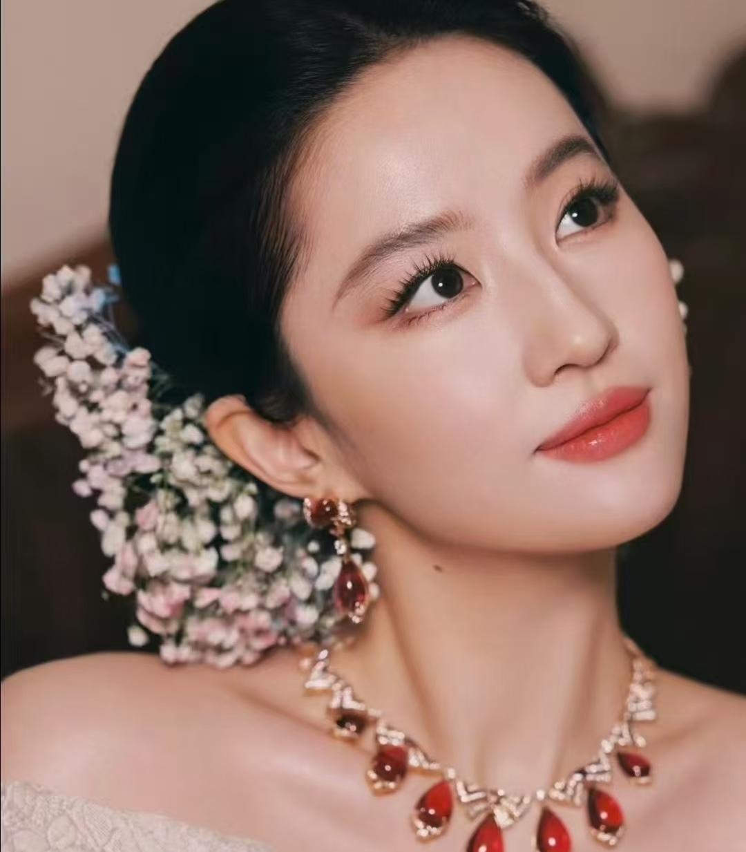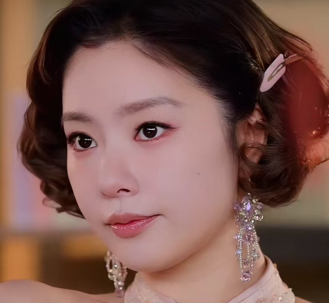 不同于以往的厚重底妆,这次的底妆清透又服帖,没有刻意遮盖脸上的小瑕疵,反而保留了原生质感,重点突出了王菊的骨相优势。眉眼部分没有用夸张的眼影和眼线,而是用低饱和的浅棕色轻轻勾勒,眼尾微微下垂,增添了几分柔和感,眼妆留白充足,少了几分凌厉,多了几分疏离感。唇色也选用了温润的淡豆沙色,褪去了以往的浓艳,整体妆容干净又高级。