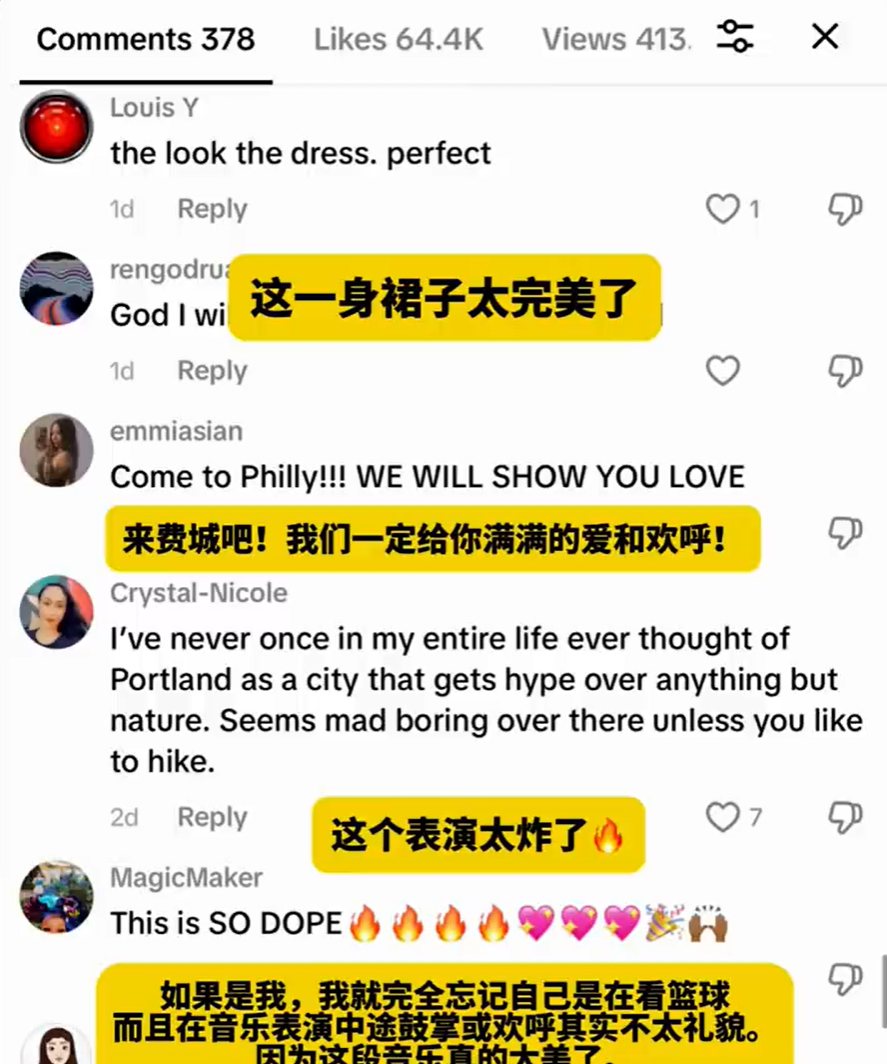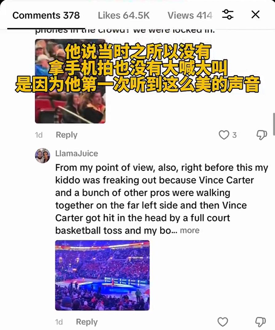 最有意思的是,一名当时就在球场的现场观众在视频里认出了自己。他在评论里解释,之所以没举起手机拍摄,也没有大喊大叫,是因为第一次听到这种声音时,被深深震住。他觉得拿手机拍反而会显得不够尊重音乐。他说,当时周围的许多观众都和他一样选择安静聆听,被来自中国的声音深深吸引。