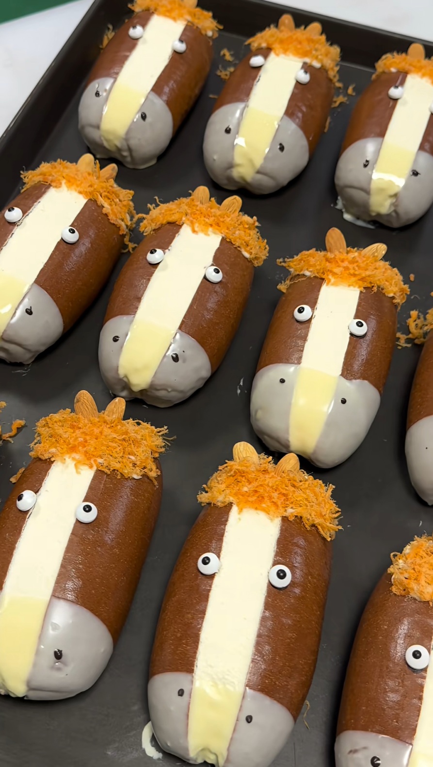 更有意思的是,这匹小马在吃法上还充满了可玩性。你可以先从它那对像隐形眼镜一样的眼睛下手,也可以从看起来不太靠谱的假发部分开始,还可以直接对准马鼻子下的那一小坨奶油。每一口都像是在参与一场带点黑色幽默的仪式。