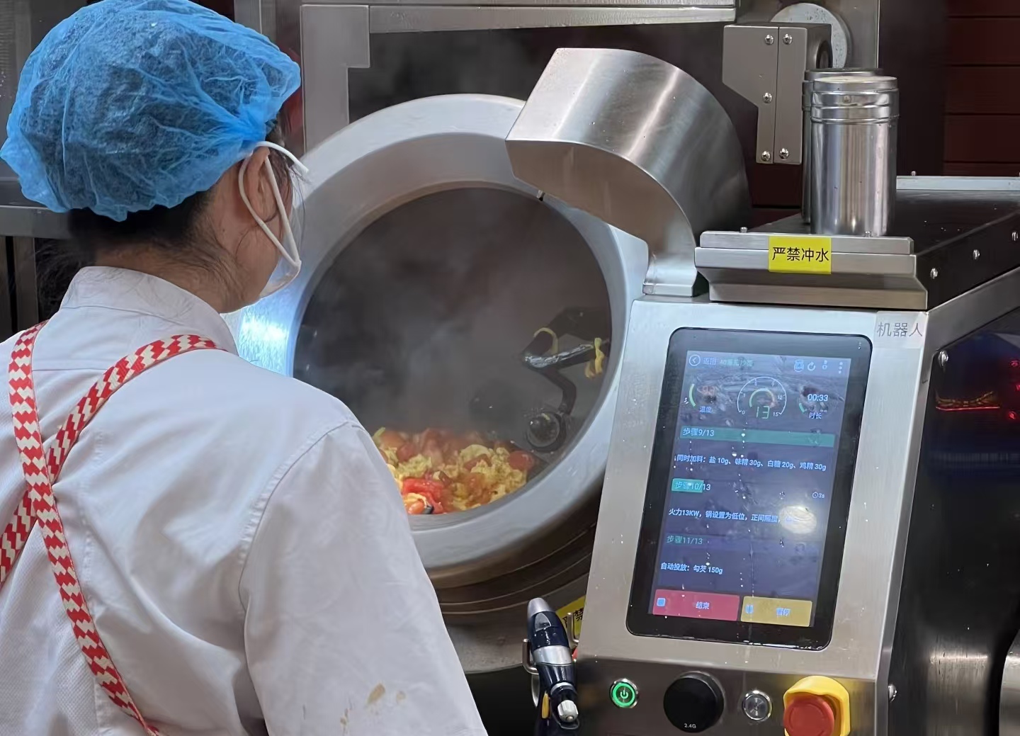 上午10点多,后厨里的两台智能炒菜机器人整齐摆放在灶台前,成了最显眼的主角。工作人员只需要把提前切好的净菜放进机器,在屏幕上点一下想要炒的菜,按下启动键,机器人就会自动开火、倒油、放菜、翻炒,全程不用人多操心。