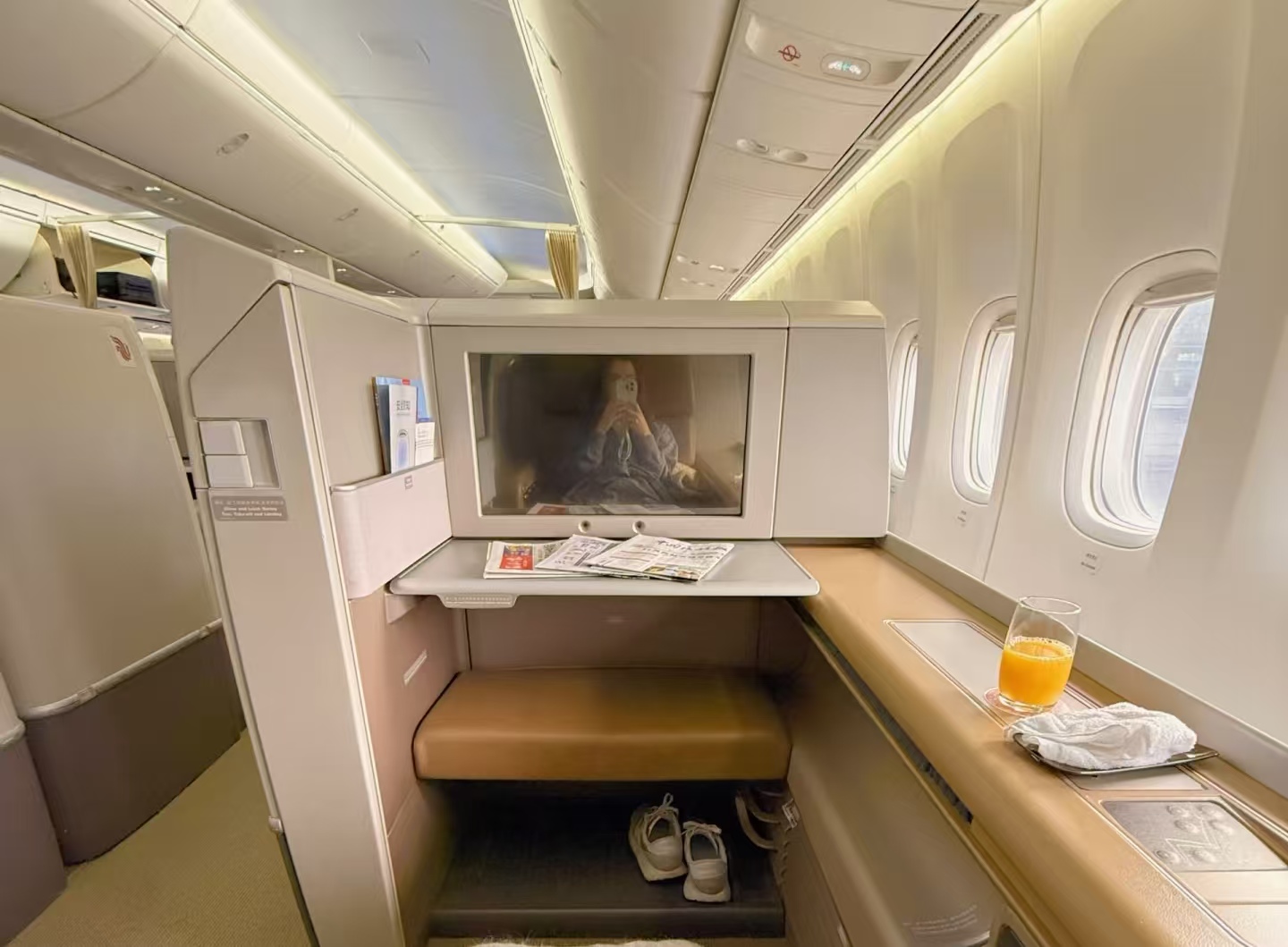 但头等舱就不一样了,座位间距最少也得60英寸,宽度更是经济舱的1.5到2倍。更关键的是,大部分头等舱座位能完全放平,变成一张1.8米以上的大床,还配着软床垫、羽绒被和真丝枕套,长途飞行时,往床上一躺就能睡个安稳觉,醒来一点不疲惫,不像经济舱,睡一觉起来浑身酸痛、昏昏沉沉。而且头等舱大多有独立隐私隔板,能隔开周围的嘈杂,不管是休息还是办公,都不会被打扰,这一点经济舱根本比不了。