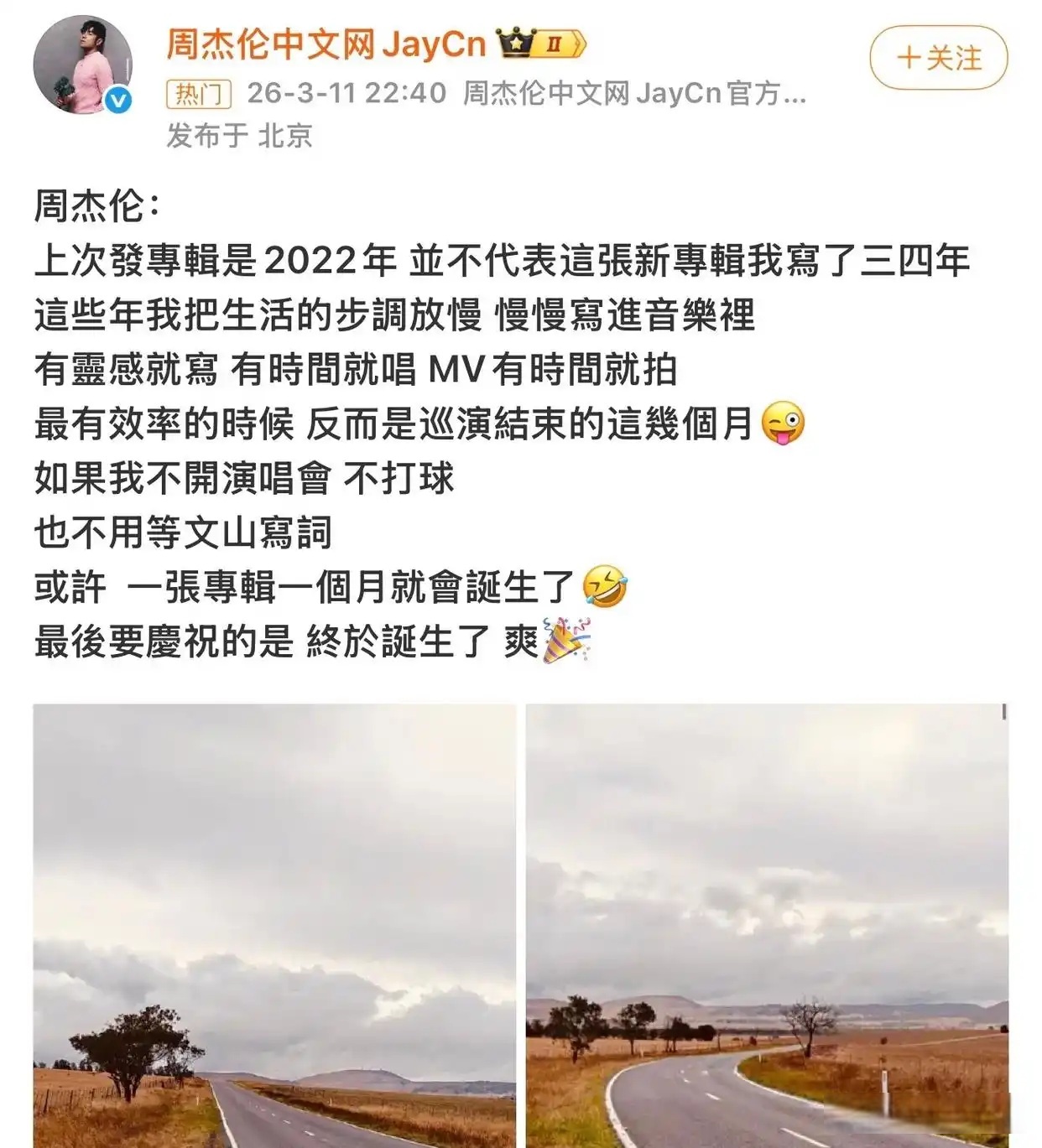 周杰伦上一张专辑《最伟大的作品》发行于2022年7月,距今已近四年。而距离他上一次完整专辑的发行,更是已经过去了六年时间。这期间,周杰伦将主要精力投入到耗时六年的”嘉年华世界巡演”(2019-2025)中,全球各地的演唱会场场爆满,一票难求。2025年12月,在台北DIOR活动上,周杰伦首度松口透露新专辑进度:”新专辑明年3、4月肯定和大家见面!”此后数月,相关动态持续印证这一时间表:2026年除夕夜直播确认专辑超12首歌曲,创个人纪录;2月25日透露仅剩3首待完成;3月3日,金牌编曲人林迈可发文”MIX完了”,暗示制作全流程收尾。3月5日,周杰伦在Instagram连发四条动态官宣新专辑本月发布,将期待值推向顶点。