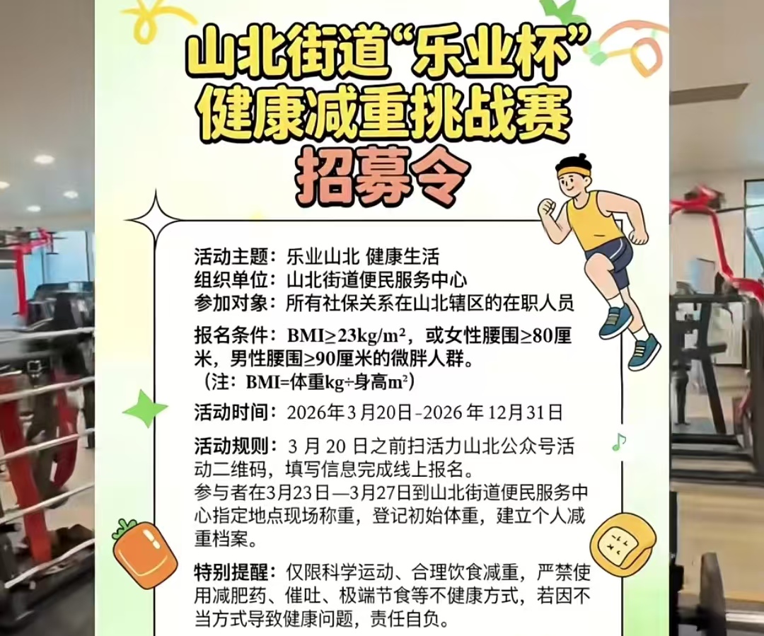 为了让活动公平有序,主办方也定了明确的规矩。想参加的街坊,得在3月20日前,通过“活力山北”公众号扫描活动二维码完成线上报名,然后在3月23日至27日,去山北街道便民服务中心指定地点现场称重,登记初始体重、建立个人减重档案,这样才能保证减重数据真实可查。
