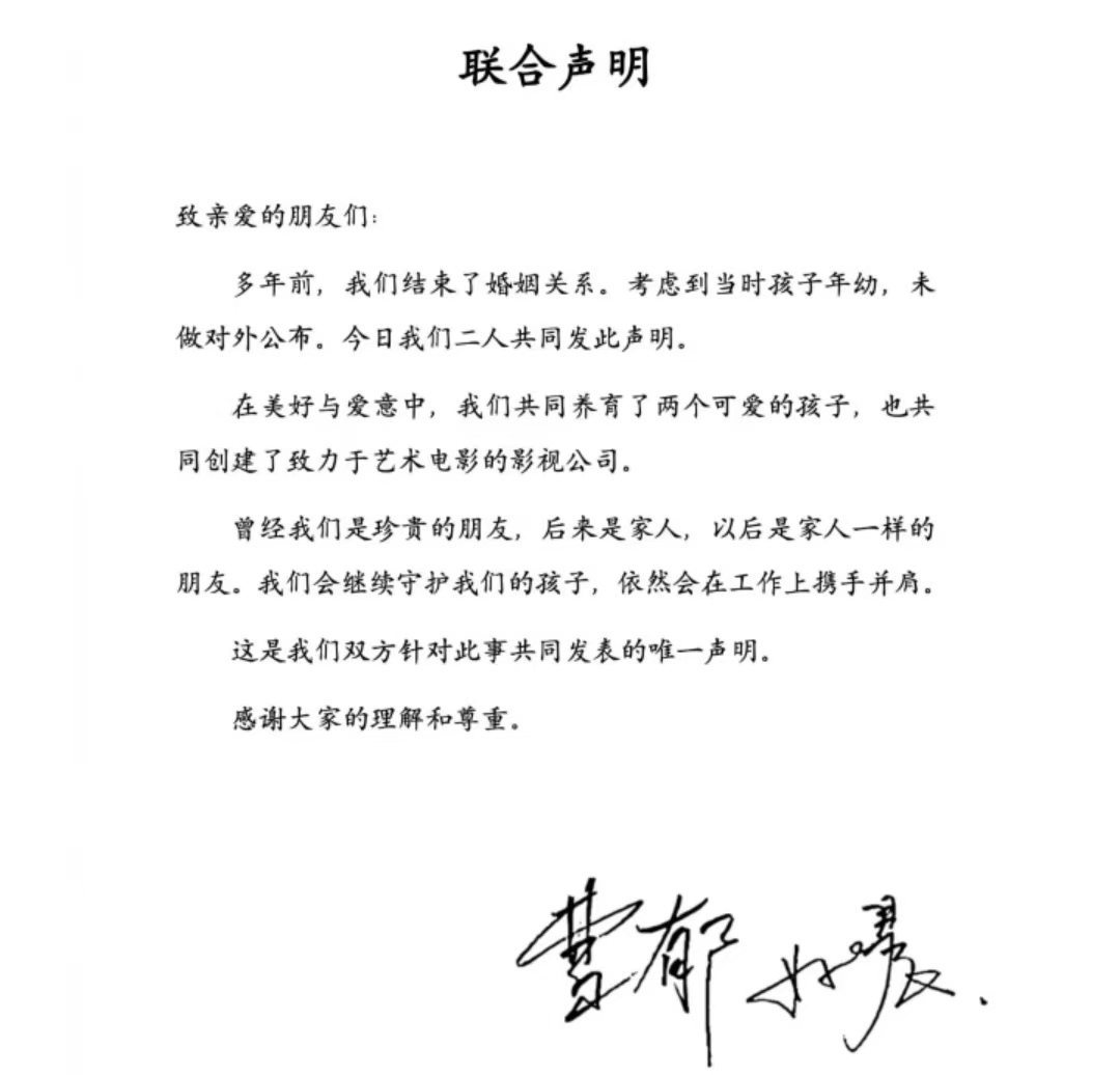 声明里写得很明白,两人其实多年前就已经离婚了,之所以一直没说,就是因为当时两个孩子还小,不想因为父母的事影响到孩子成长,所以才选择暂时隐瞒。如今孩子慢慢长大,他们才决定公开,还承诺以后会以“家人一样的朋友”身份,一起照顾两个孩子,在工作上也会继续携手合作。