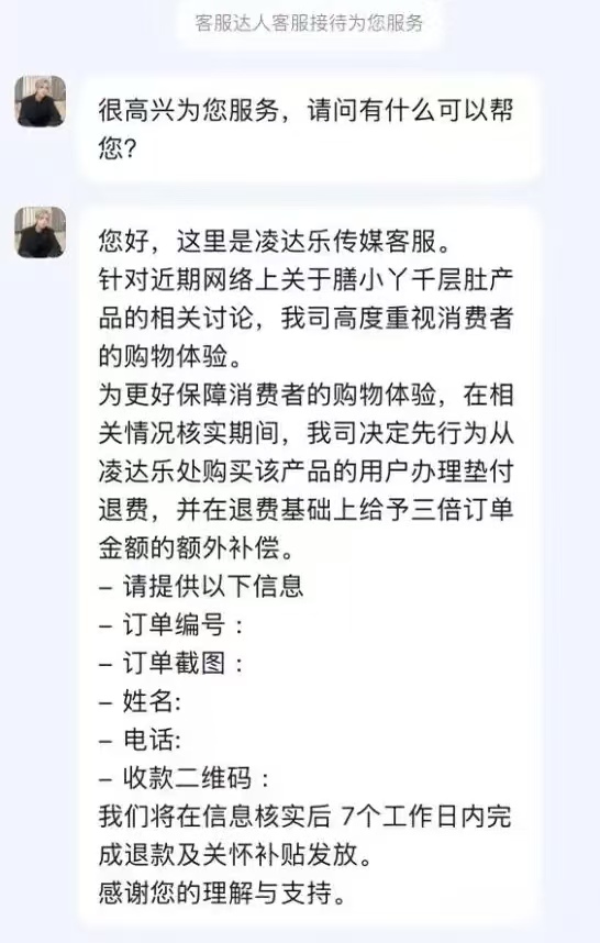 面对大家的质疑和消费者的维权要求,3月16号,凌达乐传媒的客服正式回应了。客服说,针对网上关于膳小丫千层肚的讨论,为了保障消费者的权益,在事情核实清楚之前,先给在鹿哈直播间买过这款产品的用户退款,而且在退款的基础上,再给三倍订单金额的补偿。消费者只要提供购买信息,7个工作日内就能收到退款和补贴。