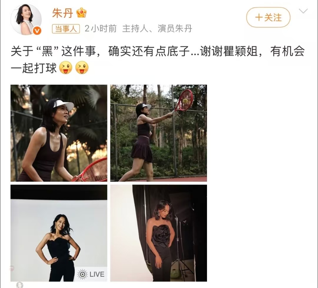 朱丹还配文调侃自己:“关于‘黑’这件事,确实还有点底子……谢谢瞿颖姐,有机会一起打球。”短短一句话,既大方承认了自己肤色偏黑的特点,又顺势向瞿颖发出了打球邀约,既化解了玩笑的小尴尬,又尽显高情商,网友们看了都直呼“太大气”。