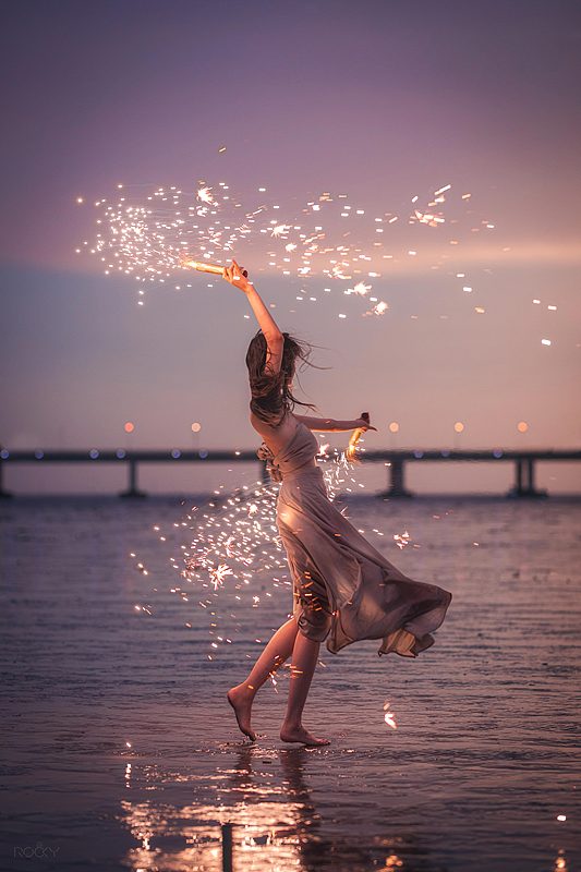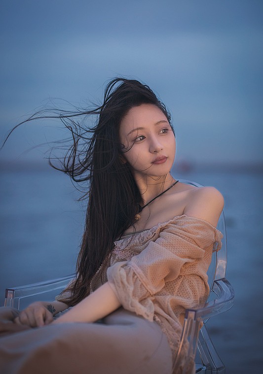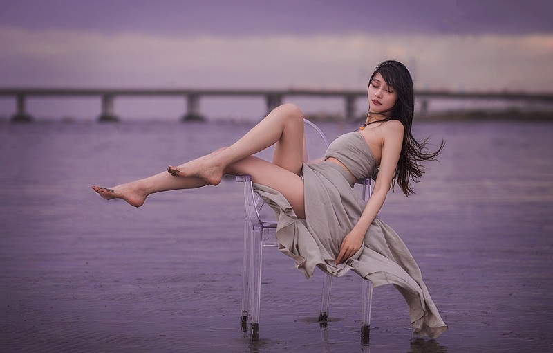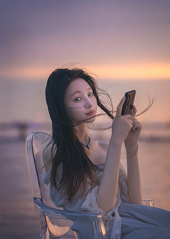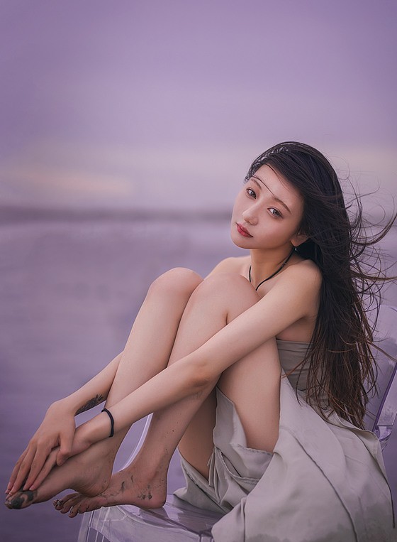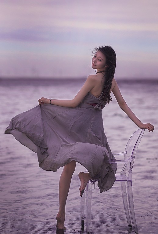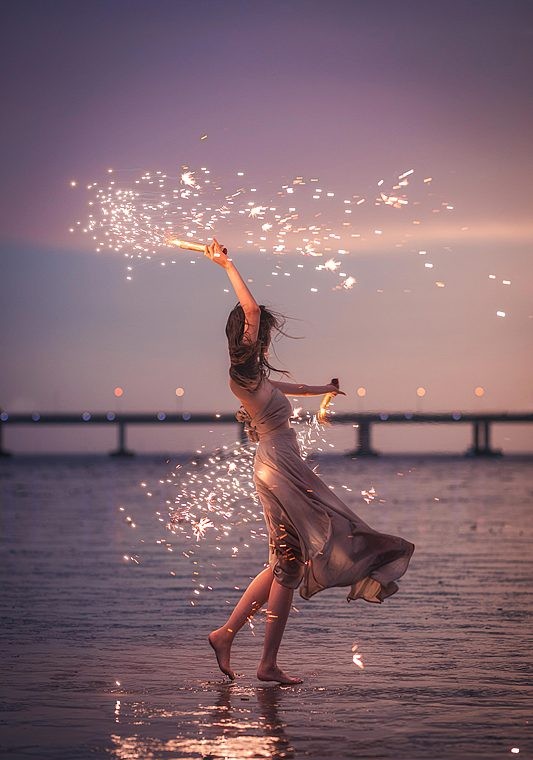 海水在黄昏里缓缓铺开,天空被柔紫与微金轻轻晕染。轻盈的裙摆与长风相遇,脚步在浅水中留下短暂的回声;火花划过夜色,像星子坠入人间,又很快归于宁静。透明的椅影、远桥的线条、浪声的节拍,共同构成一段慢下来的时光——在风与光的交汇处,身体与心绪一同舒展,把这一刻交给海与夜,留给记忆。
