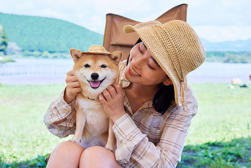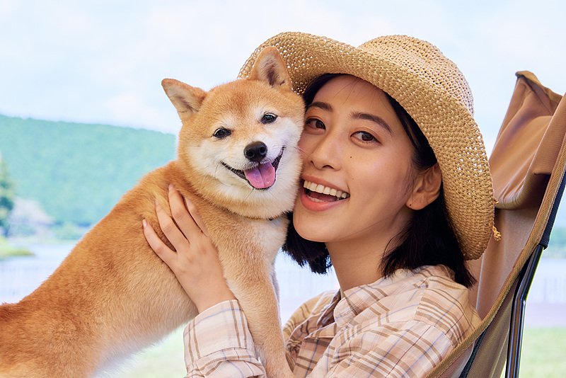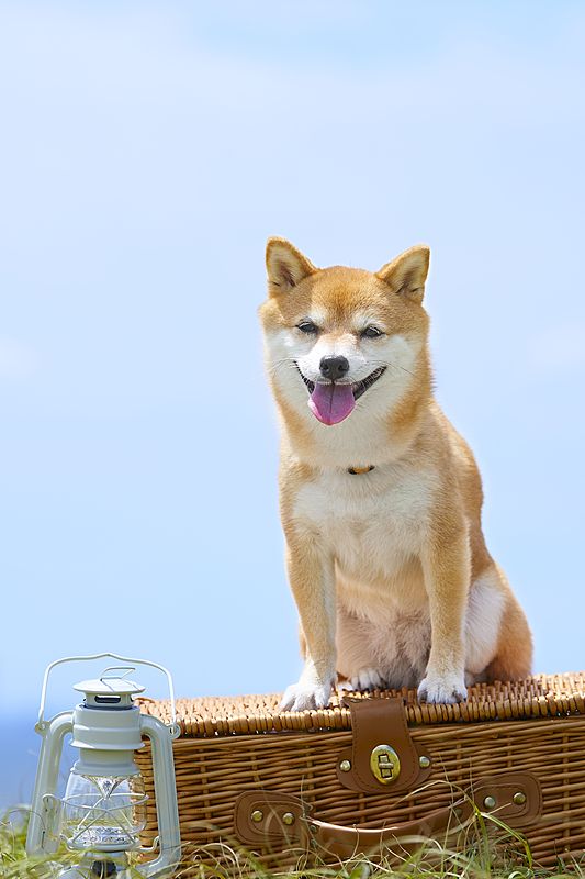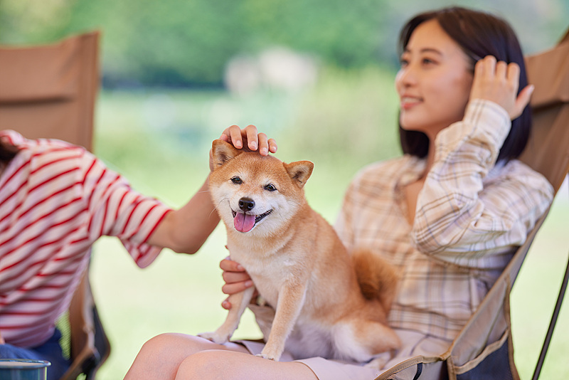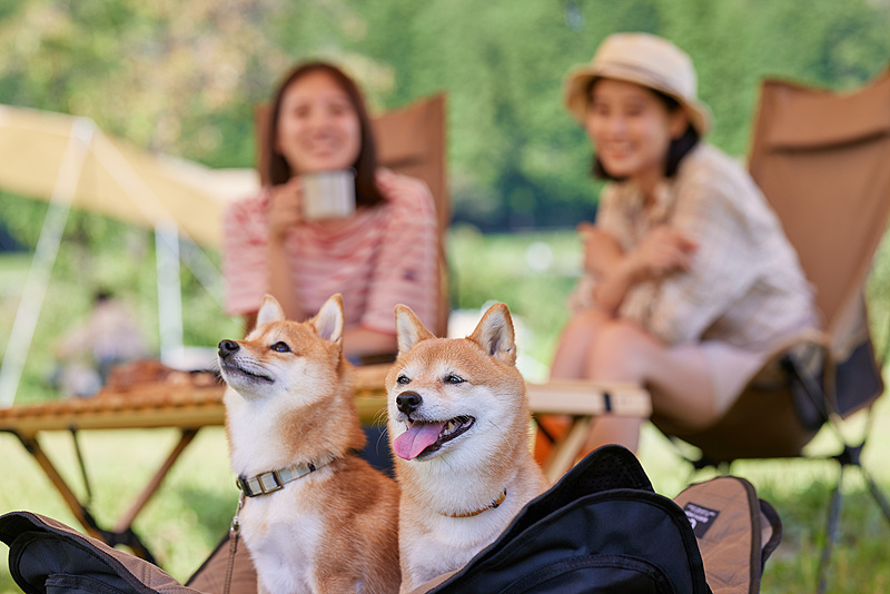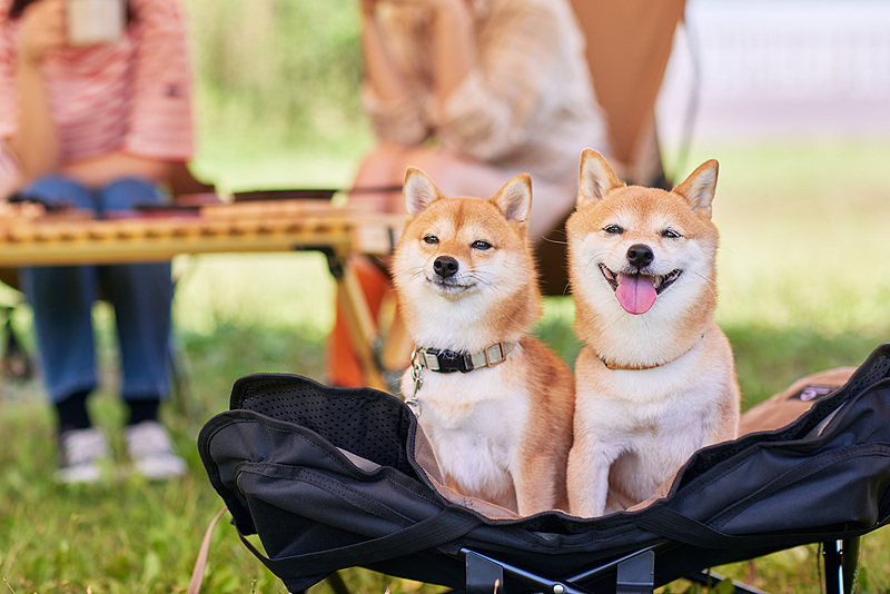 两只柴犬并排坐在折叠椅/营地装备前,表情各有各的节奏:一个稳、一个更热烈。 “你更像左边那只,还是右边那只?”