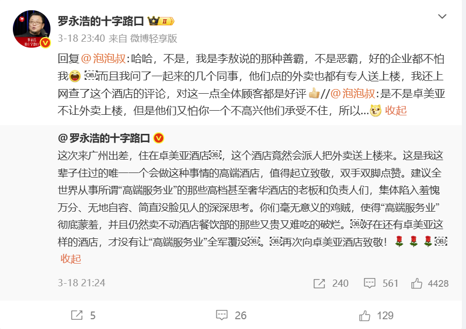 有网友在评论区提出猜测,认为部分酒店并不允许外卖进入客房区域,这次之所以破例,是否与住客身份有关,担心一旦服务不到位会引发不满。对此,罗永浩在互动中作出回应,表示自己并非外界想象中的强势人物,而是更偏向于温和理性的类型。他还补充说明,同行的同事在同一家酒店点外卖时,同样享受到了专人送餐上楼的服务,并非个例。